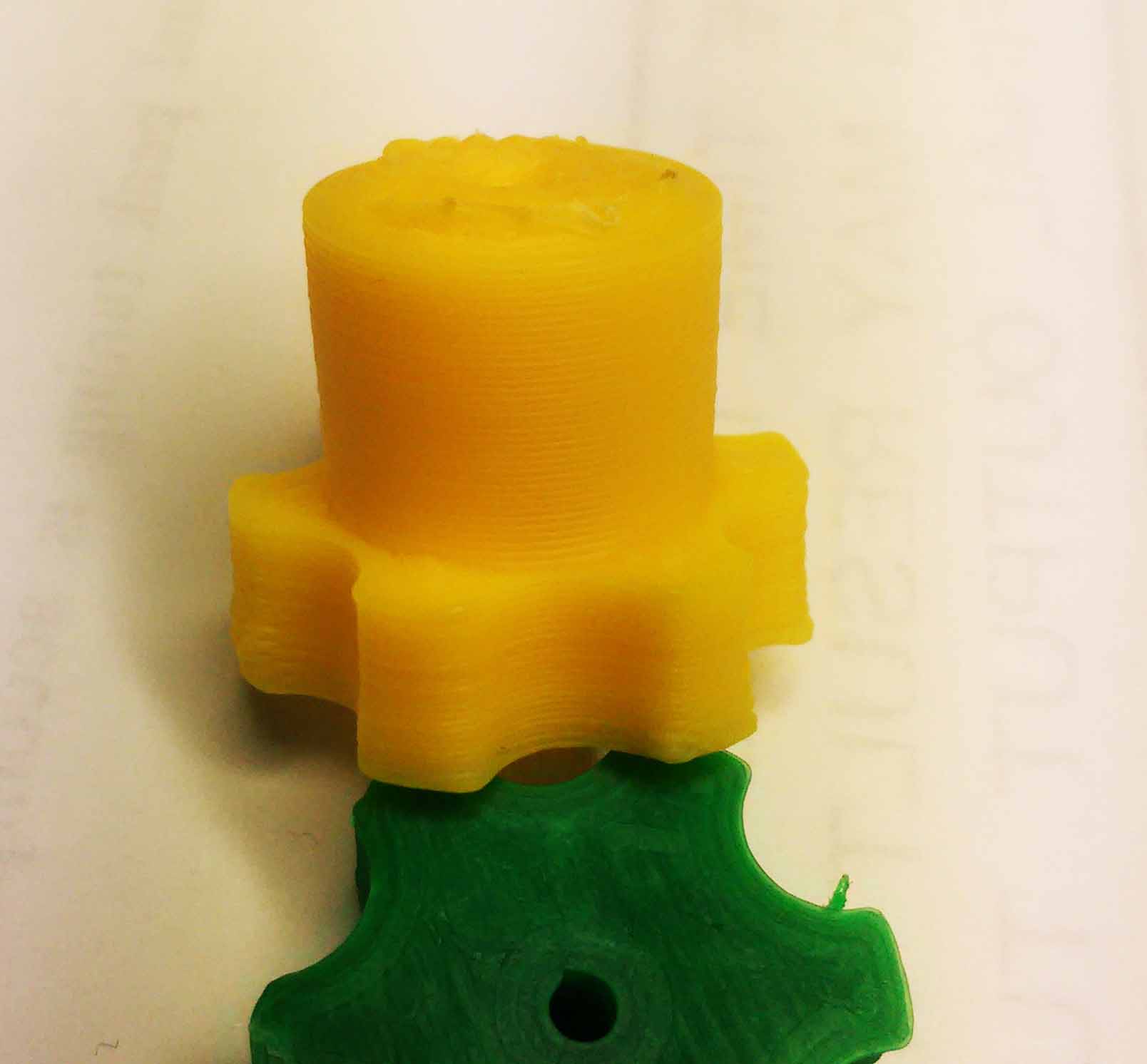 Potom jsem zkusil vytisknout knoflík na regulaci bed samozřejmě na jiný filament od 3DW žluté ABS. to, aby to nebylo tak jednoduché, ale nic jiného jsem neměl. No a tady vznikl malý problém. přikládám zase obrázek a mnou vygenerovaný G-code. Tam je vidět na začátku, že mám jiné hodnoty "solid infil a top infil". Nemohu zaboha přijít na to jak tyto hodnoty ovlivnit. Ve výsledku to vypadá, že mě infill pořád trochu předbíhá ext. perimetr. Na obrázku je to vidět.