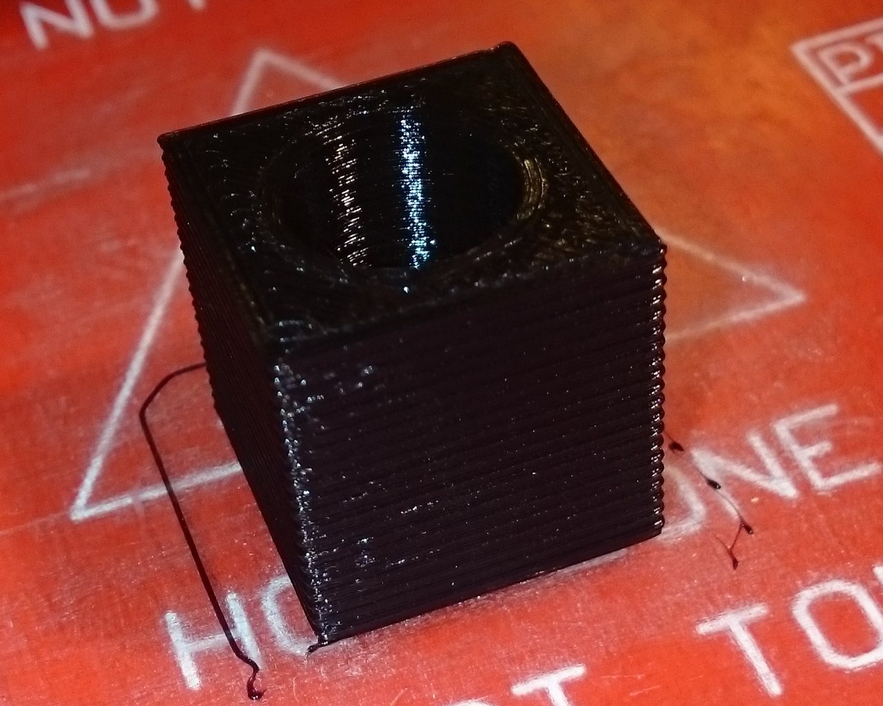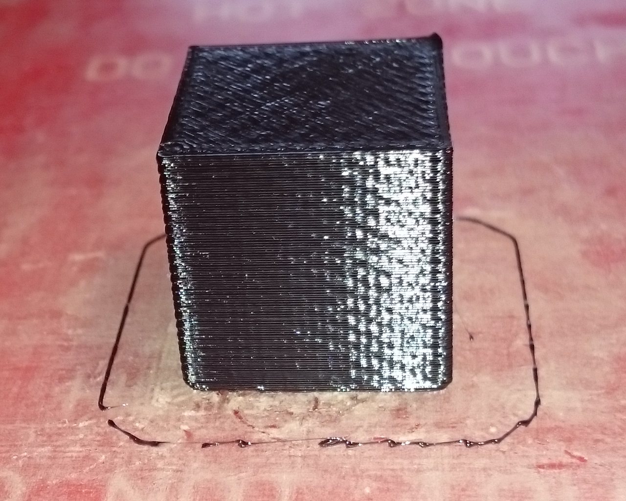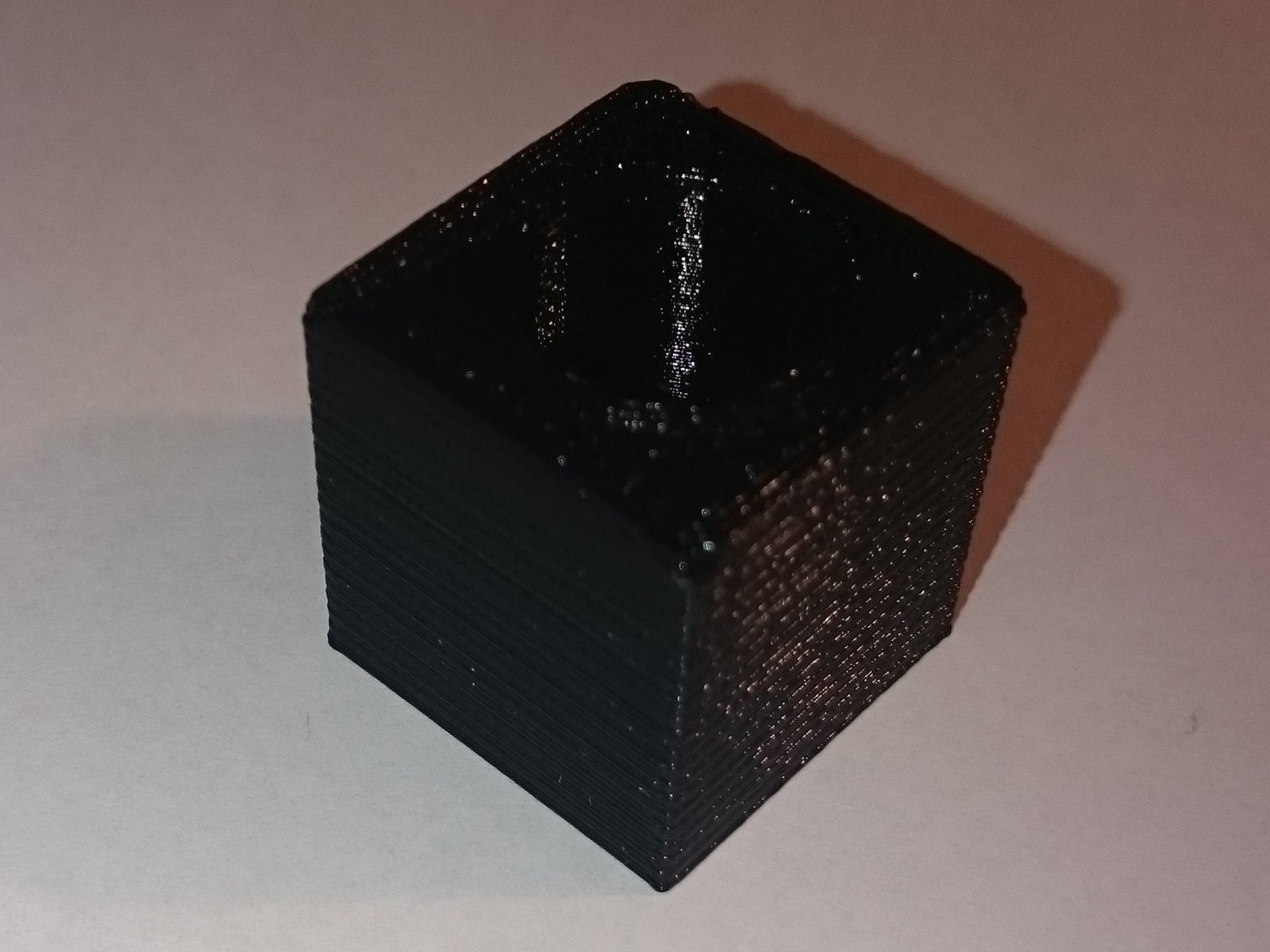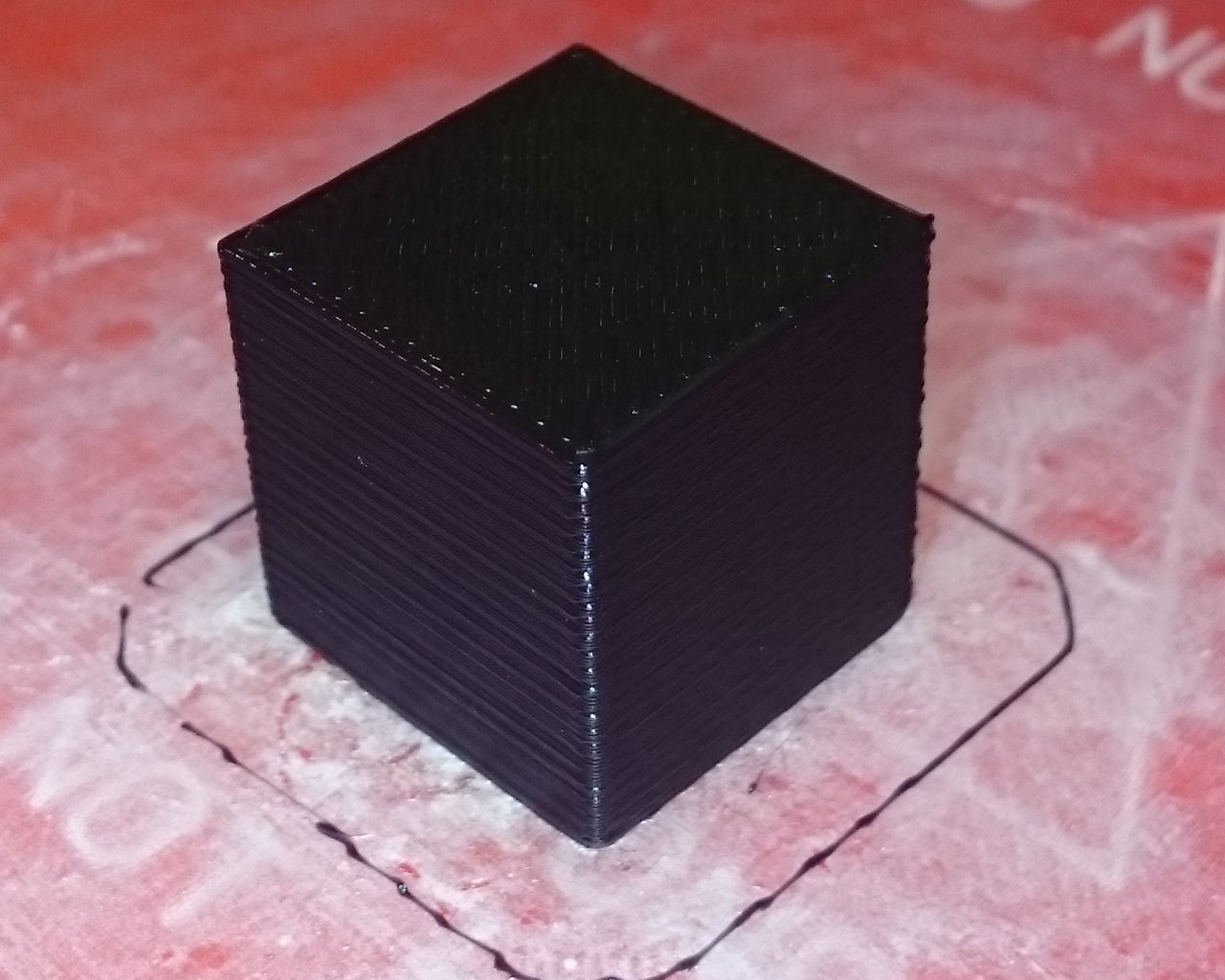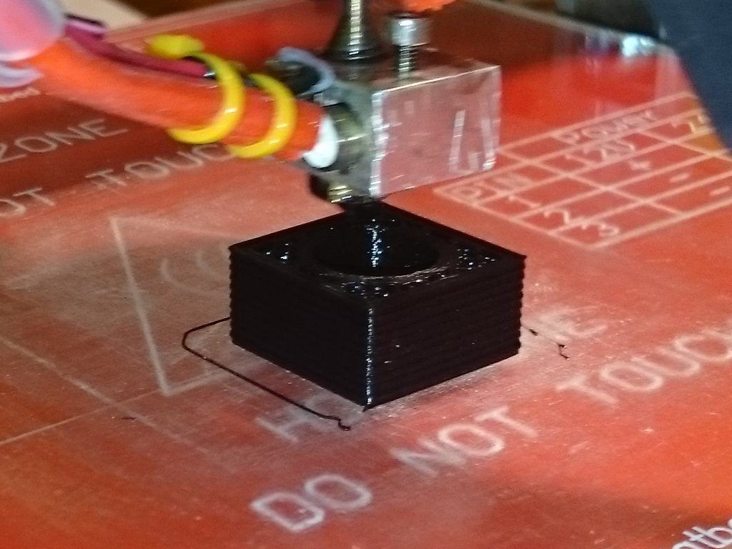 Zkoušel jsem tisknout obyčejnou kostičku, ale problém je, že první, druhá vrstva se vytiskne správně, ale pak další vrstvy jsou takový divný, tryska jakoby stoupala pomaleji, než přibývají vrstvy, takže to dopadne tak, že reje už do vytištěného.