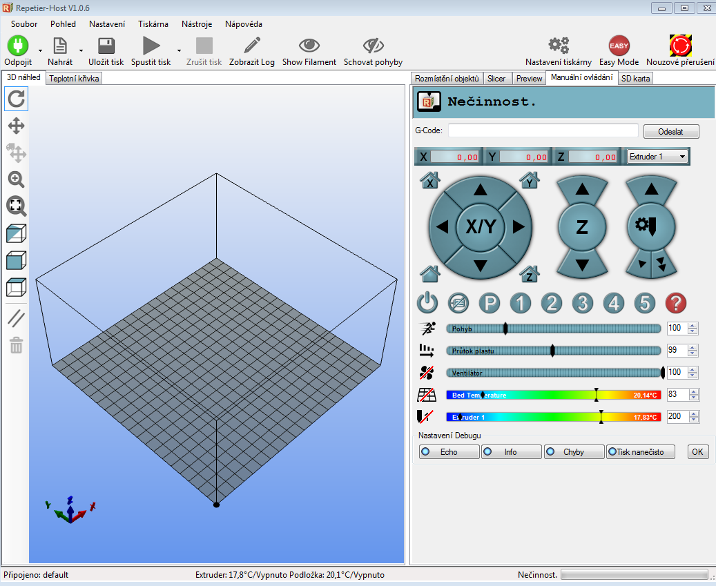 http://www.jrc.cz/kestazeni3d - Mirror Arduino IDE 1.06 a přesto mi to stavy endstopů nehlásí. Teplotu však vidím, což je mi záhadou. Dneska se zkusím ještě pohrabat v nastavení u zmíněného FW.