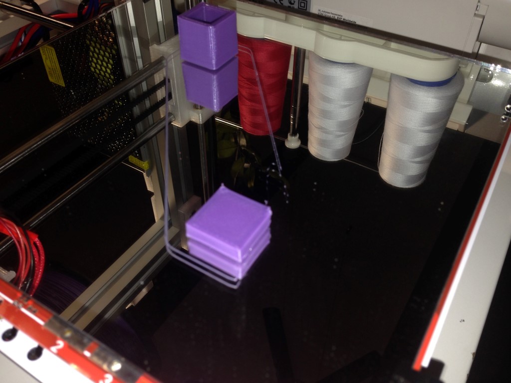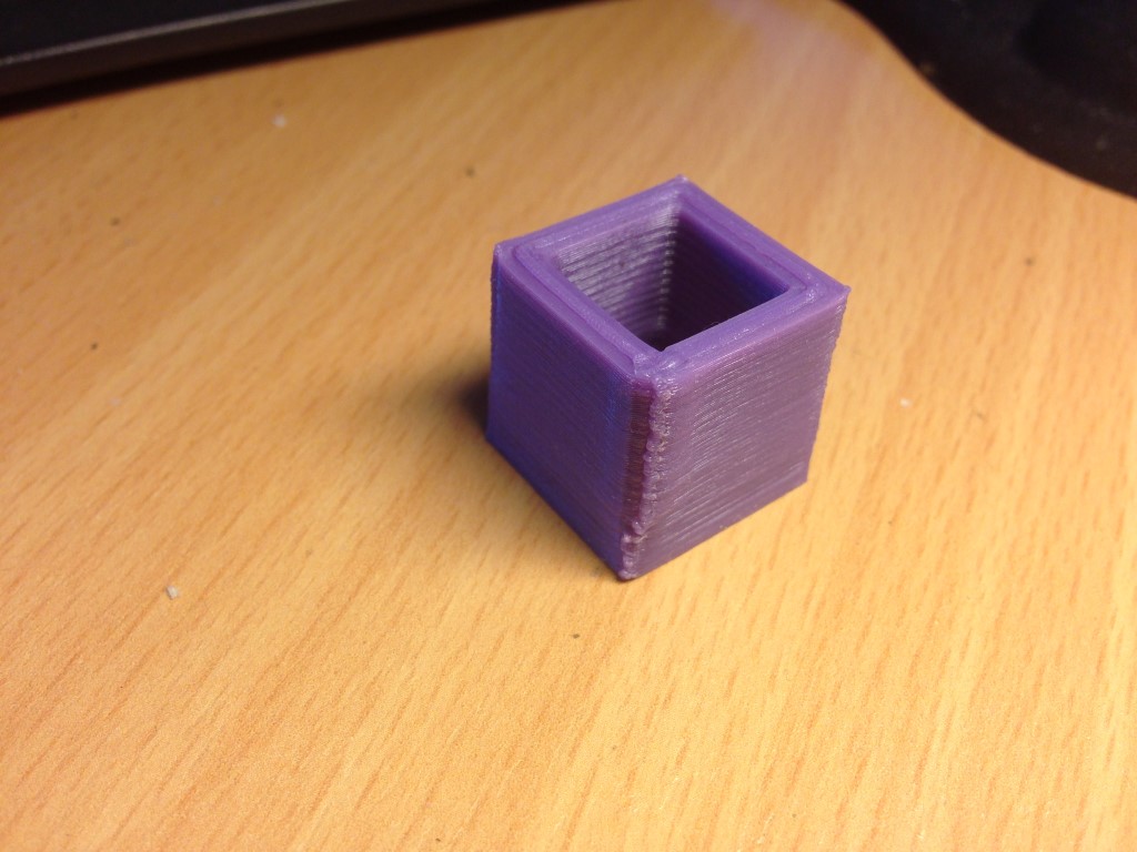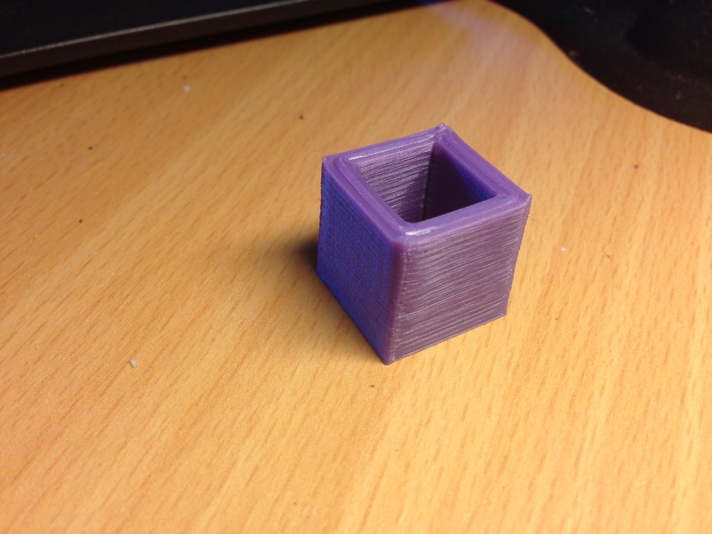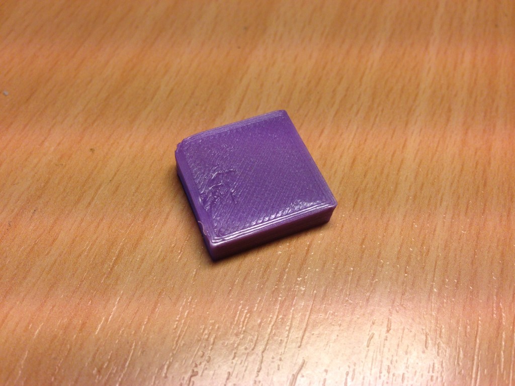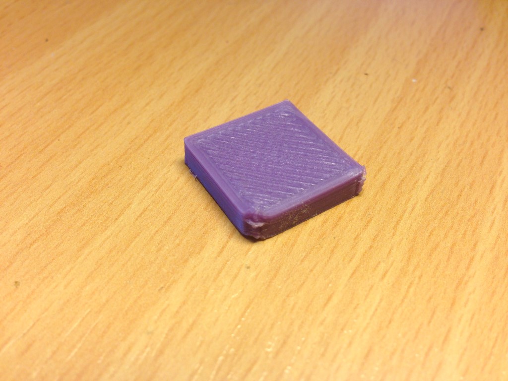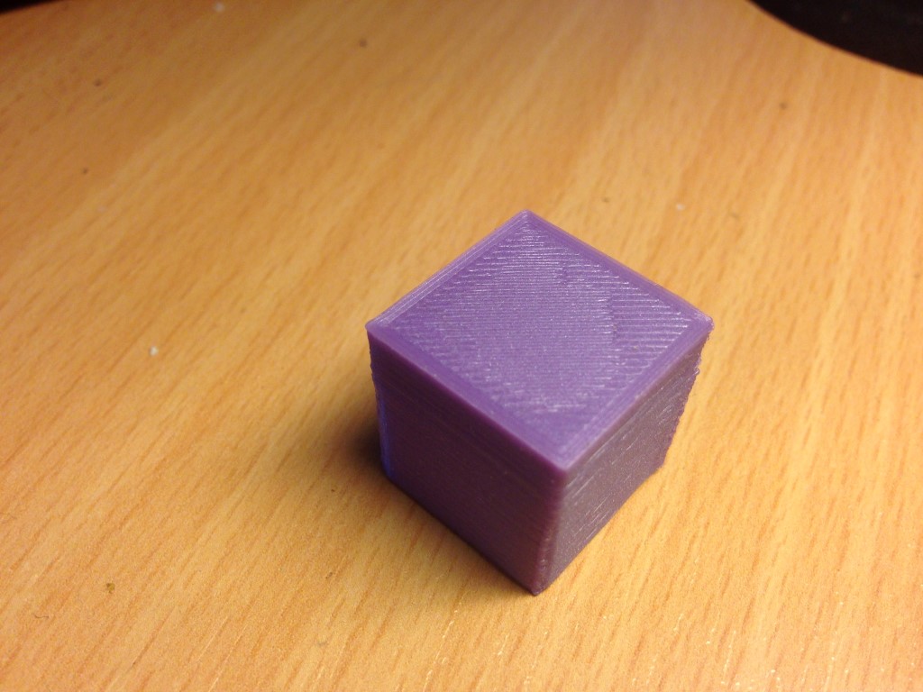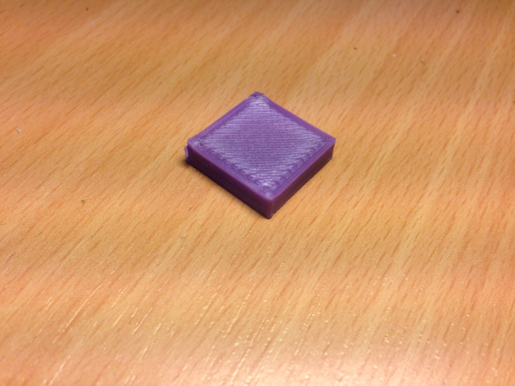 Tak výsledek dnešního snažení. Testovací kvádřík vyšel už velice pěkně. Nalepil jsem na Bed modrou maskovací pásku. Teplota 45 stupňů a drží to nádherně, děkuji Otomarovi. Chlazení jsem dodal ventilátor 60x60x25 a přirouboval jej na vozík extruderu nasměrovaný na hlavu a hrany se přestaly kroutit. V jeden moment mi začal přeskakovat motor extruderu, tak jsem mu hned fousek přidal a byl pak klid. V zubatici podavače extruderu se usadil nějaký drobný bor.... Možná to mělo vliv na zbytek tisku, jsou tam vrstvy kde je vyloženě málo materiálu, ale podávací motorek už nepřeskakoval kroky.