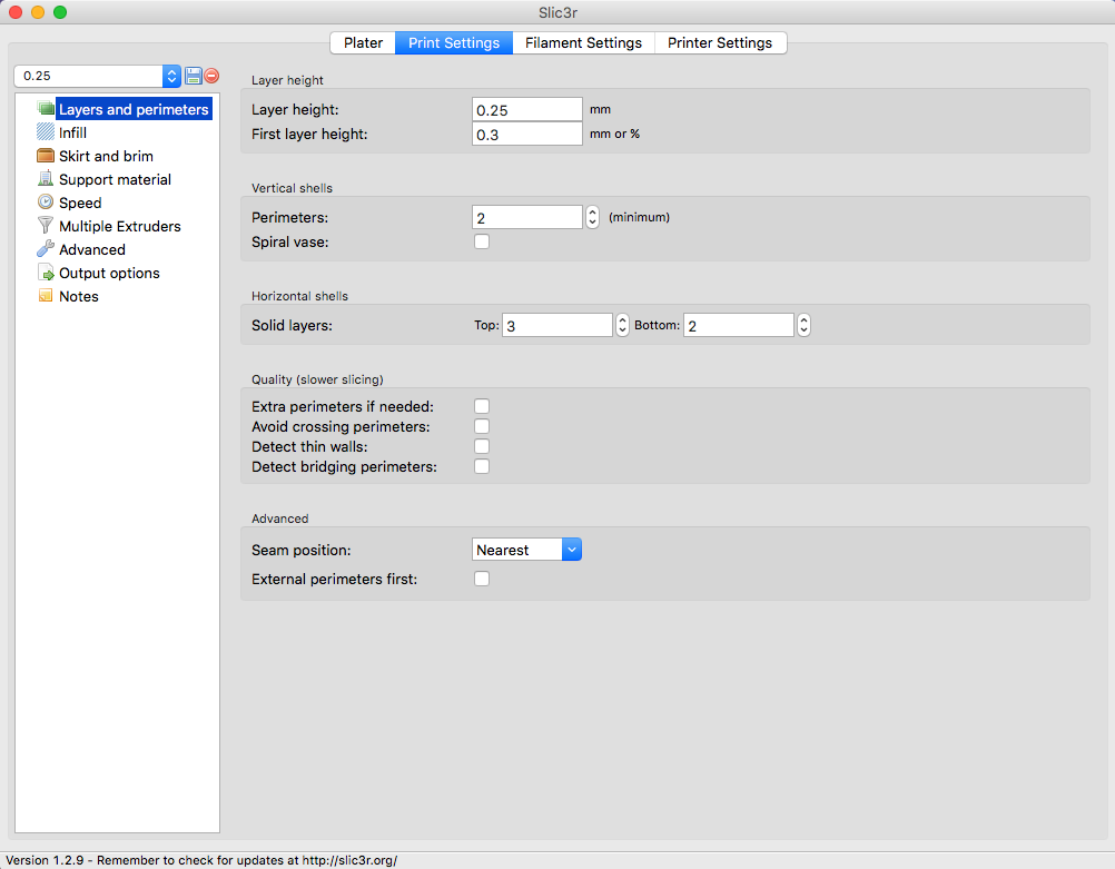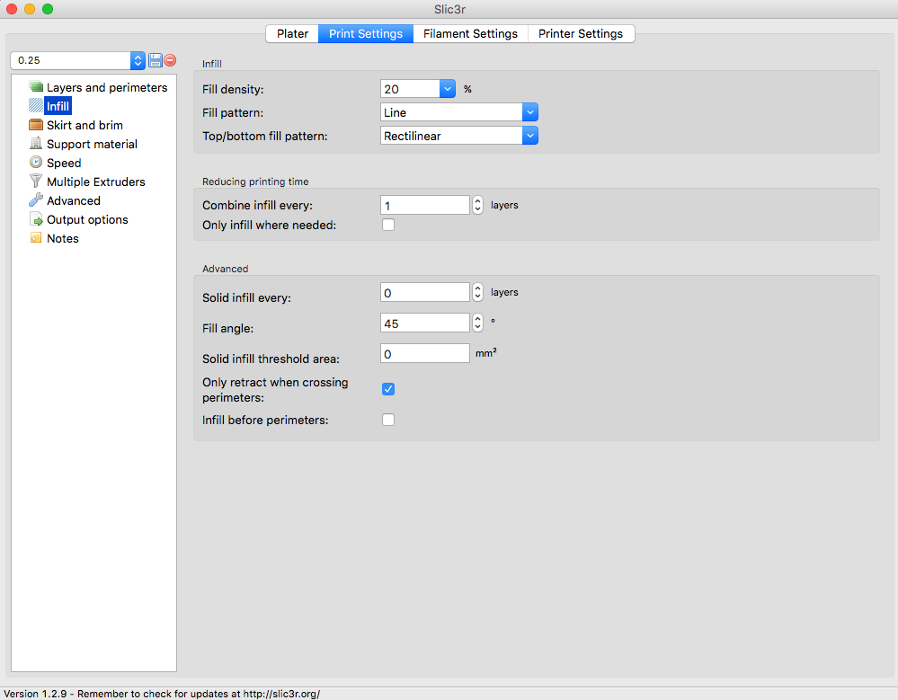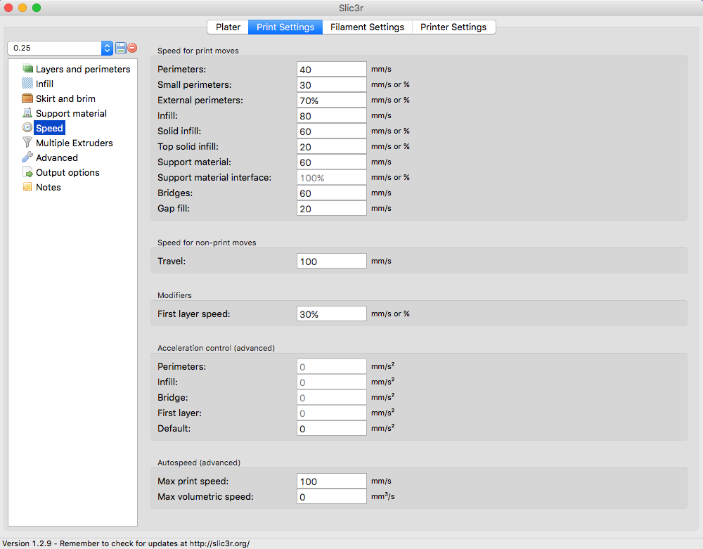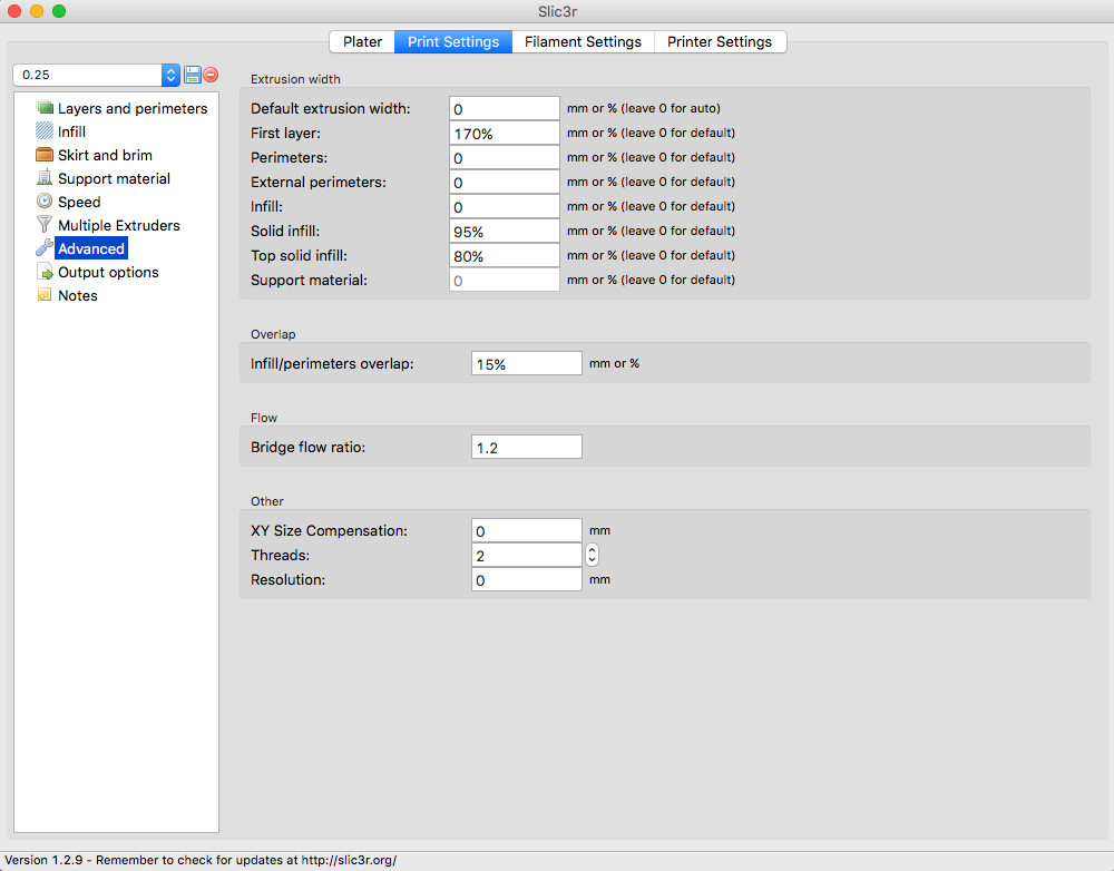 Zdá se že Slic3r pro OSX je trochu jiný než pro Windows.