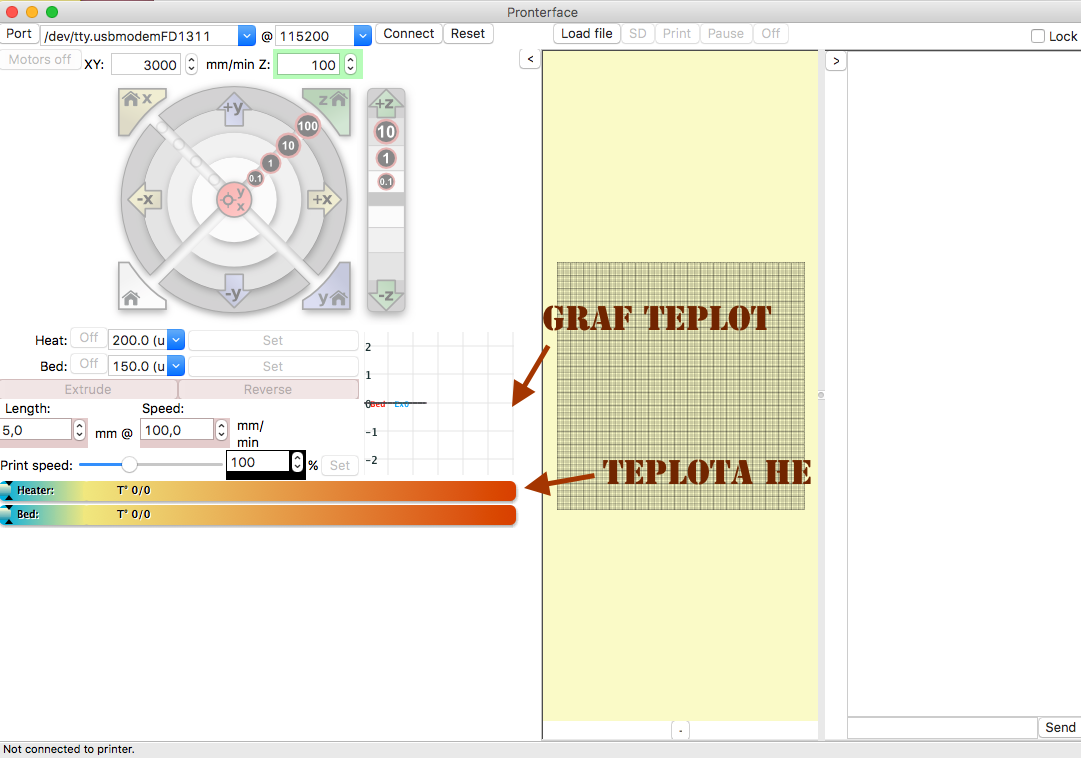 Připoj se k tiskárně. Nastav teplotu HE třeba na 230° nech to nahřát a chvilku běžet a ukaž nám jaký je průběh teplot a co je vpravo v logu. Stačí screenshot.