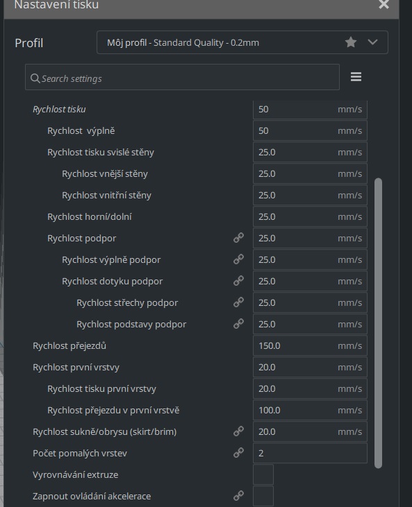 Takže kolik máš nastaveno u položek Wall speed (= vnější perimetr)? Defaultně tam bude 50% z Print speed, což je rychlost, kterou se ti perimetry tisknou.