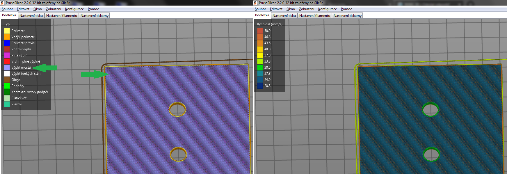 Lebo ako prvu vrstvu po mriezkovej 10% vyplne nastavi ako vypln mostov a tym padom aj rychlost. Aj ked dam vypnut Detekovat perimetry premosteni vysledok je rovnaky.
