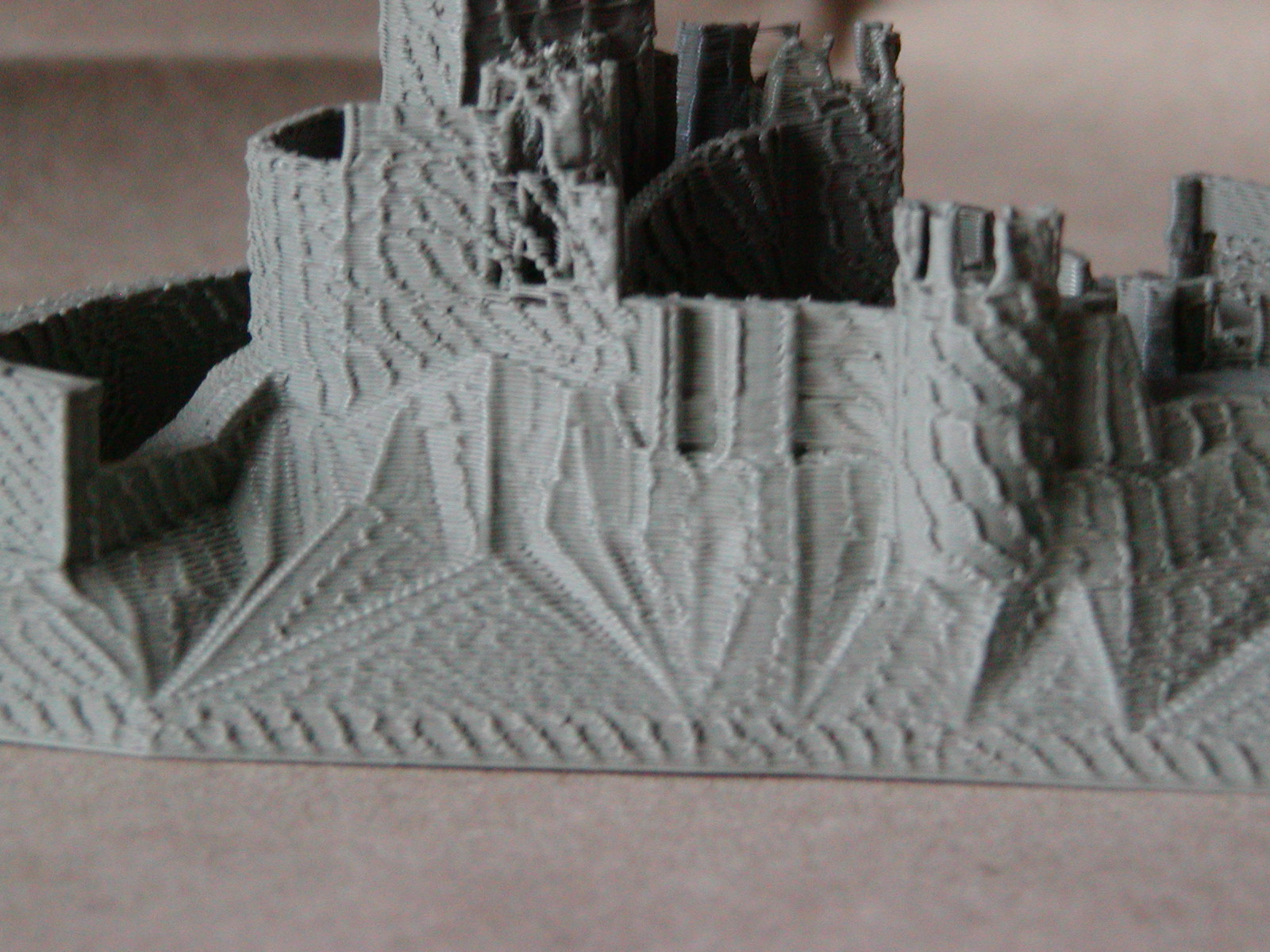 Na obrázku jsou vidět tenké stěny tisklé jen svislou pohledovou skořápkou. Ta stěna je děravá. Plast od začátku tisku takové stěny ulpíval nepravidelně jen na předešlé překážce.