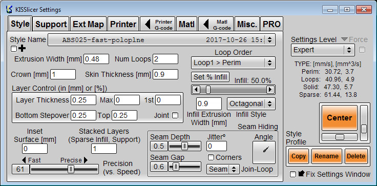 vonkajší perimeter prvý, vrstvy 0,15, perimetre vonkajší 30m/s, vnútorný 45mm/s, infil 50 alebo 60mm/s, malé 20mm/s