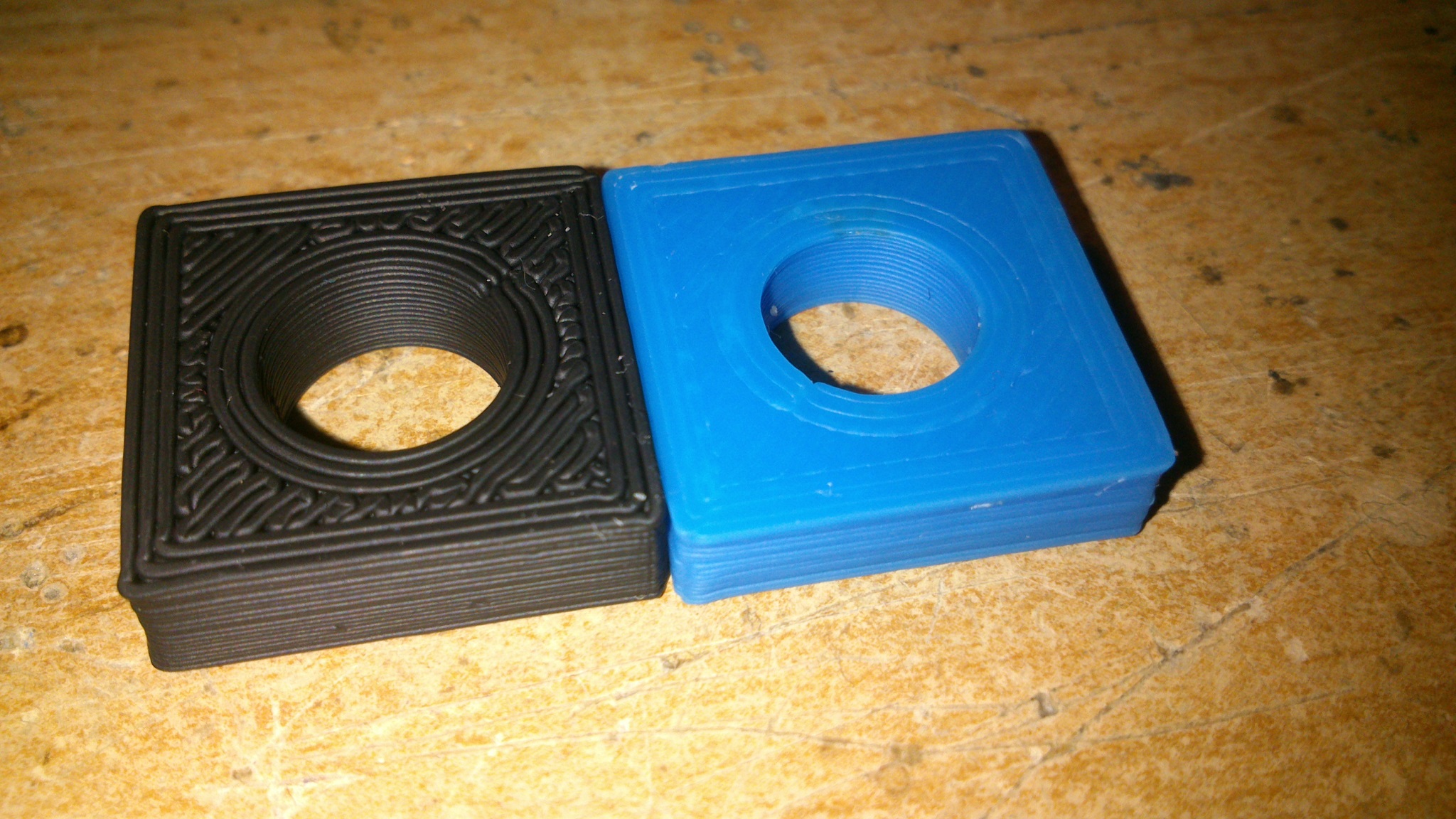 U modré kostky byla tryska nízko, jak bych chtěl, spodní vrstva je úplně hladká a jednolitá, protože byla pěkně přitisklá tryskou k zrcadlu, celý to na zrcadle pevně drželo a rohy se nezvedaly. Problém u tohoto je, že při home pozici je tryska tak nízko, až drhne o zrcadlo a to určitě není dobrý. Potřebuju teda, aby výška první vrstvy byla třeba 0.3 mm, ale tryska aby byla třeba 0.2 mm vysoko (je v tom započítaný i papír - 0.1 mm). Ve finále bude ta výška vrstvy třeba 0.27 mm, ale to mi nevadí a pěkně si to sedne na zrcadlo.