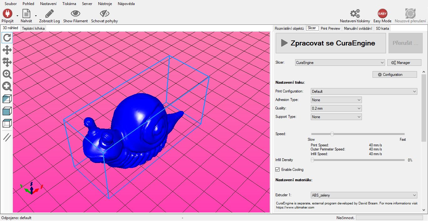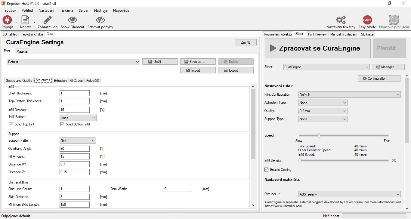 Nic jsem nenastavoval, pouze jsem dal výplň na 0% a rychlost snížil na 40mm/s