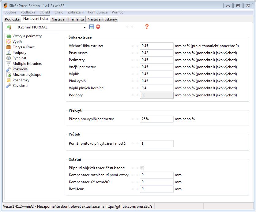 nenastavuj sirku extruze v %, ale v mm. Profily mam ma foru, jinak pro 0.4mm trysku a bezne tisky pouzivam toto: