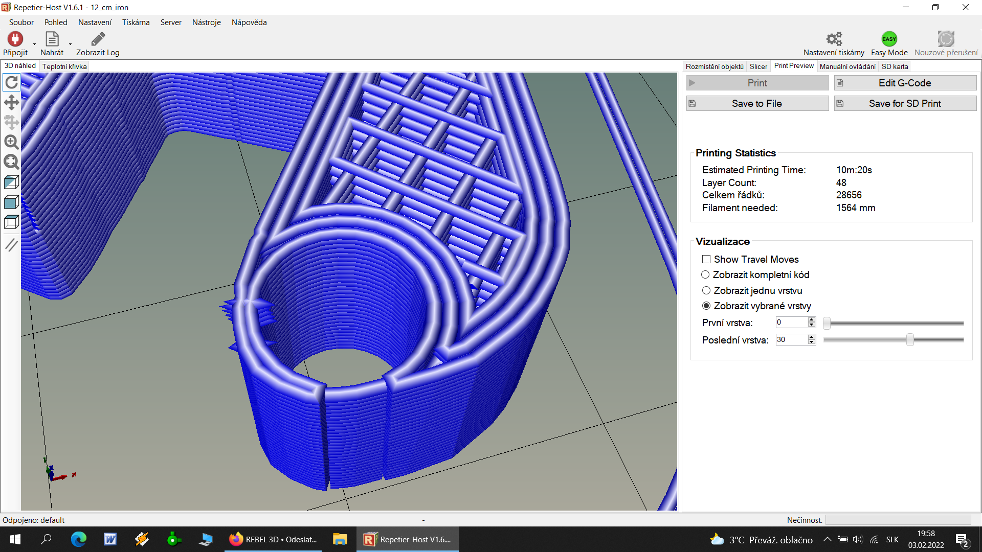 Asi se pri pokusech s Marlinem vyresetovala EEPROM a nezustalo nastaveni kroku extruderu. Doladil jsem to (opravdu extruder daval malo). Poladil jsem i osu Z, takze jezdi plynule - vodici tyce meli lehouckou sbihavost na horni strane, takze to tam pak blbe jezdilo.