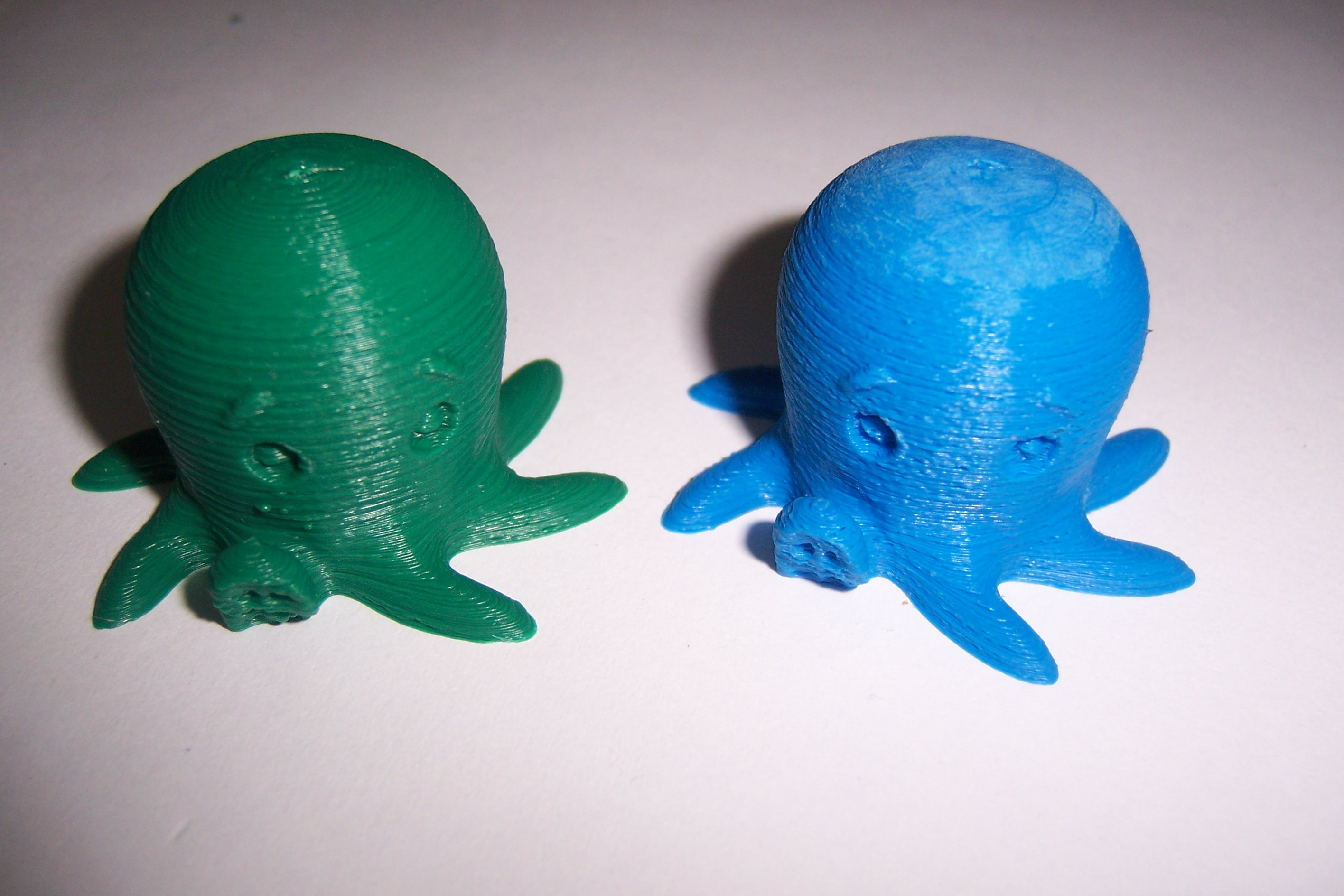 Tak se mi konečně podařilo identifikovat problém. Slic3r z mně neznámého důvodu mi dávkuje strašně málo materiálu do perimetrů a infillu - určitě to půjde vyřešit nastavením v Slic3r -> Advanced a tam upravit dávkování, ale už nemám nervy na to si s tím teď hrát. Zkoušel jsem chobotnici slicovat v Cura Engine a zjistil jsem, že mám v EEPROM naopak nastavenou o něco málo větší hodnotu na dávkování materiálu, než by bylo potřeba. Viz fotka níže. Modrá chobotnice je slicována v Slic3r a zelená chobotnice je slicována v Cura Engine. Obě jsou tištěny tryskou 0,4mm a tloušťka vrstvy je 0,15mm. Rychlost tisku modrá 30-40mm/s a zelená 50mm/s.