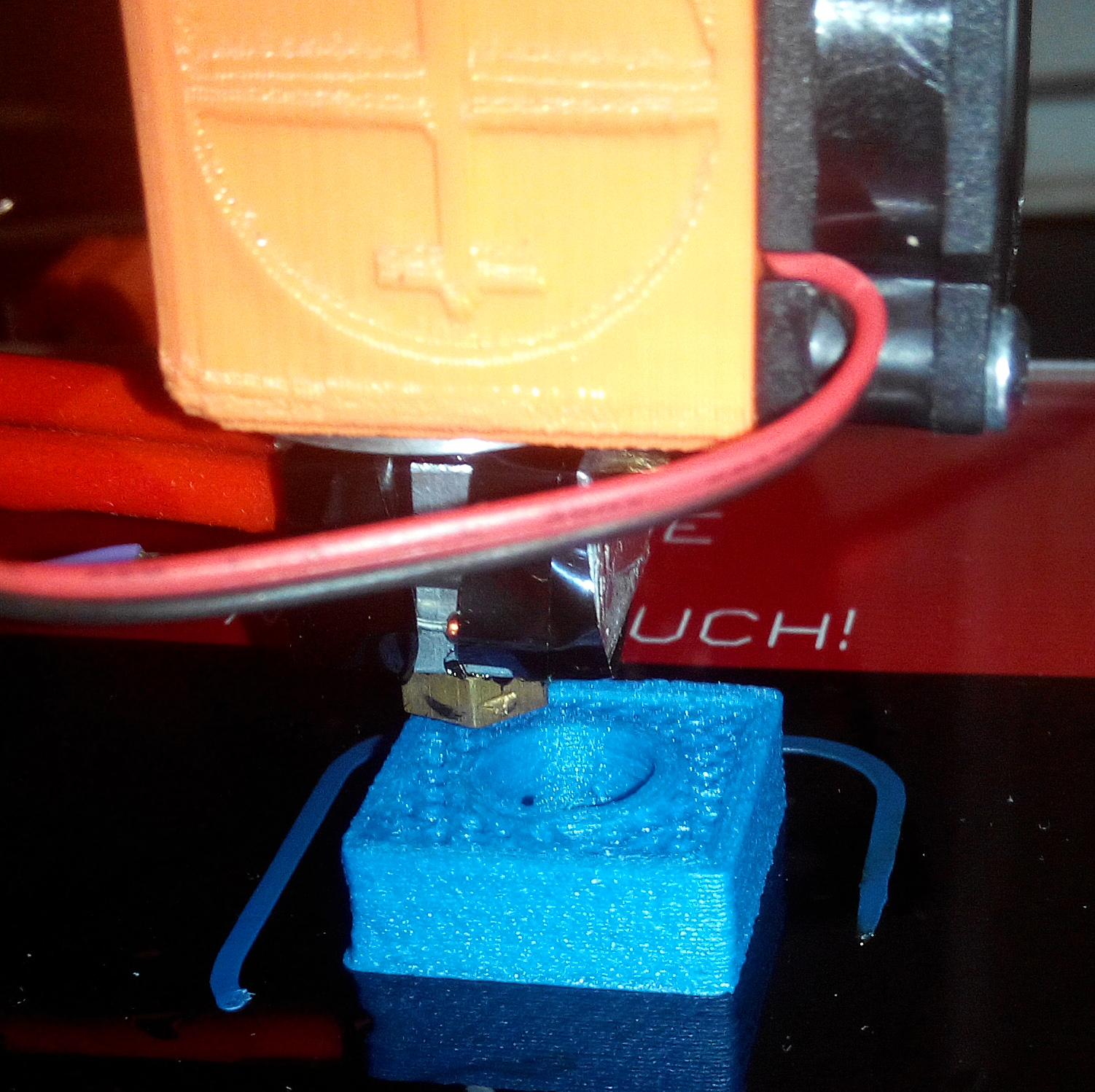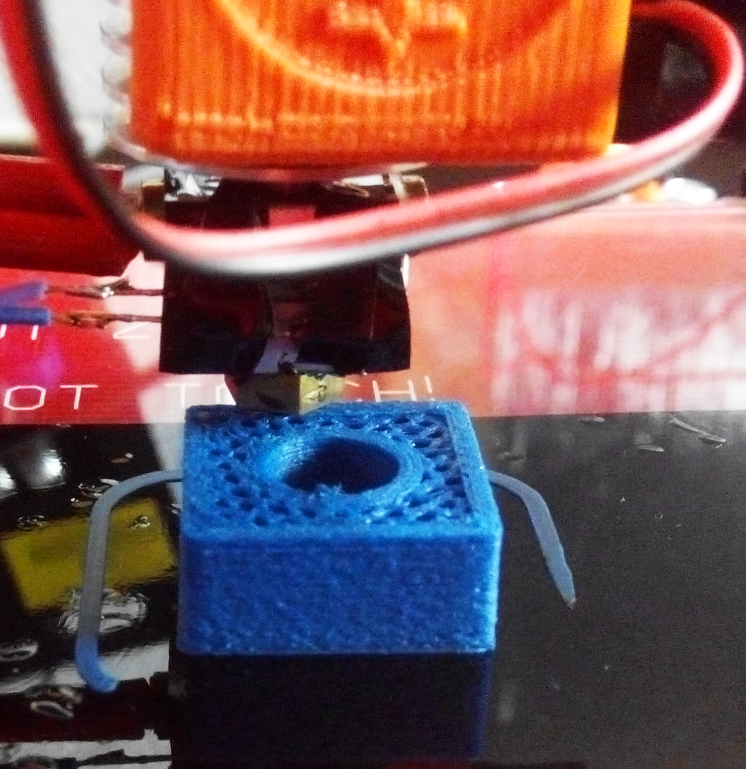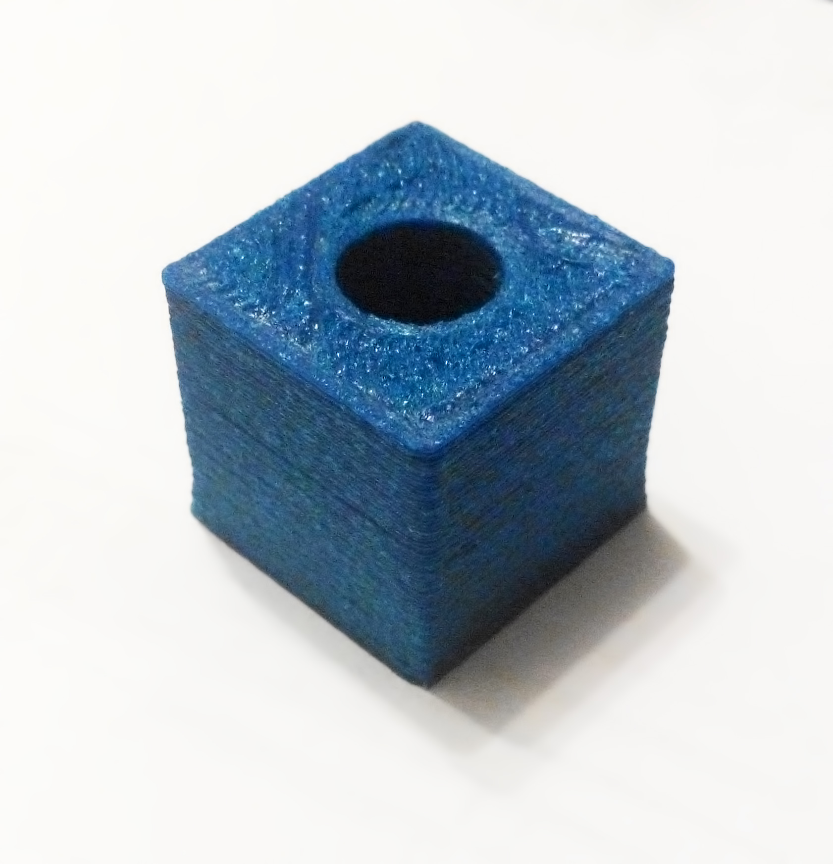 Po píšťalce jsem se vrátil k testovací krychli, 2x2x2 cm, 1 cm průměr díry. Postupně jsem snižoval teplotu dokud filament nepřestal prskat, dostal jsem se až na 190°C (ale mám špatnej termistor, nevejde se do díry na hotendu, myslím, že předává špatné hodnoty). Tisk se podle mne vyvedl velmi dobře. Nicméně jistě najdete mnoho námětů/tipů k diskuzi. Například na finální fotce je vidět, jak jsou nakonec první vrstvy mírně širší než ostatní...