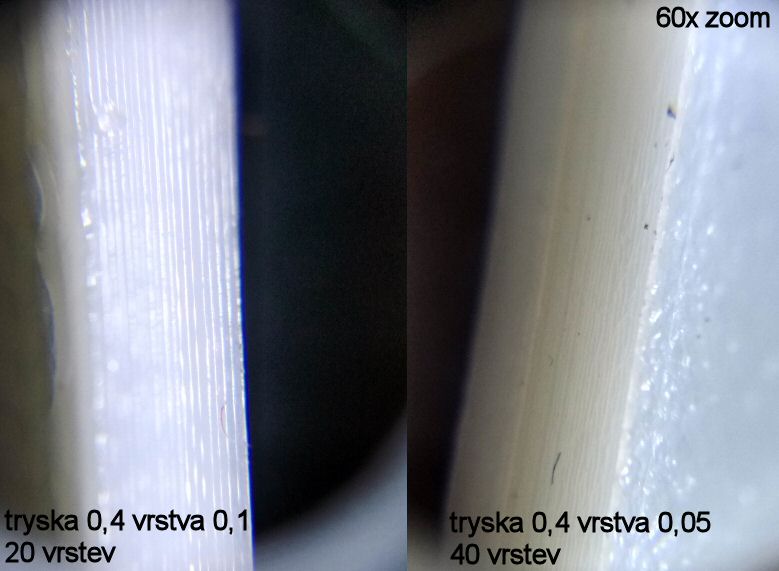 Tady malá ukázka jak vypadá tisk vrstev 0,1mm u mě (detail je 60x lupa na mobil - líp detail s dostupnou fototechnikou neumím).