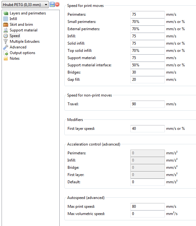 Teplotu mám nastavenou na 238°, rychlosti viz obrázek. Proud na motorech mám určitě dostatečný - zkoušel jsem zastavit pohyb rukou - síla, kterou to tlačí je přiměřená, rozhodně se to nezastaví hned po dotyku ruky...