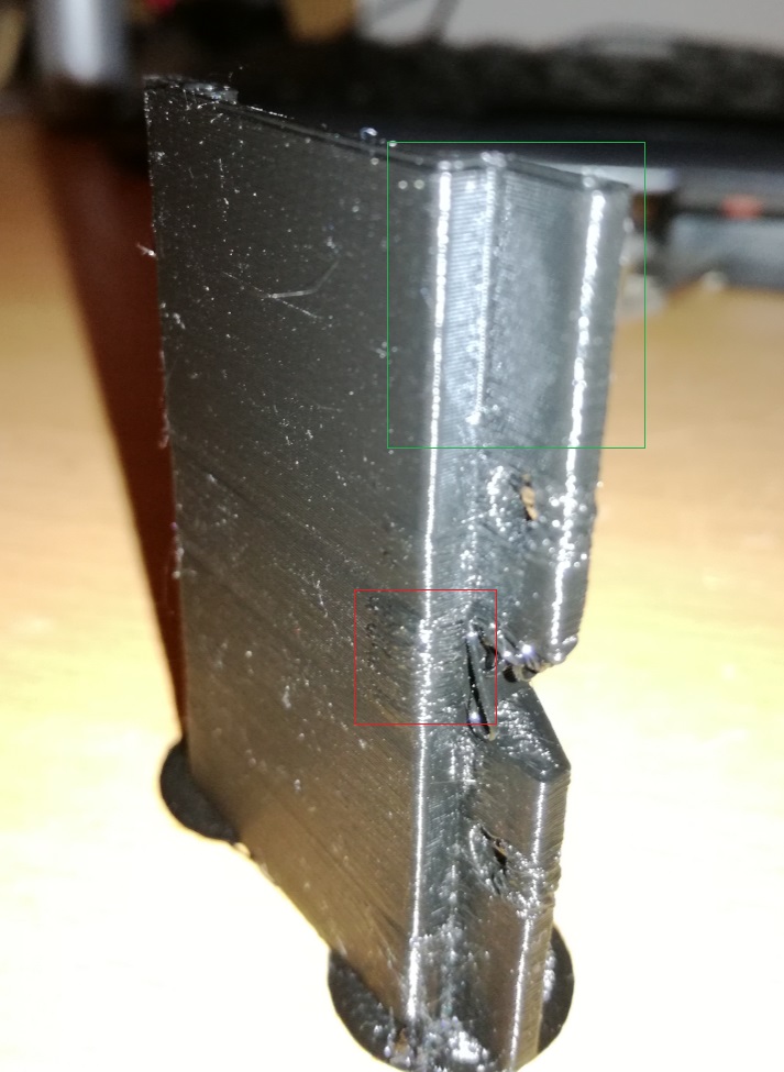 rad bych vas pozadal o potvrzeni/vyvraceni mych domnenek :) jedna se o muj teprve druhy vytisk respektive prvni z PETG. moje domnenka je ze teplota byla nastavena moc vysoko (240°C) postupne jsem ubiral az jsem se dostal ve vrchni casti (oznacena zelene) na 230°C tam uz jsem byl +/- spokojen. Jedna se mi zejmena o oznacena mista (cervene). Prijde mi, ze se tam vrstva diky tomu, ze je kratsi moc prohrivala a rohy se zacaly bortit.
