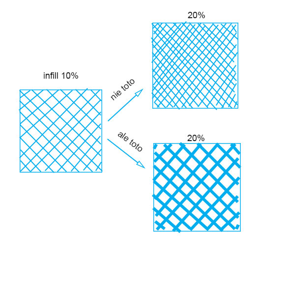 Nenastavuj pro infil procenta, ale konkrétní šířku extruze (např. 0.8 mm při 0.4 mm trysce)