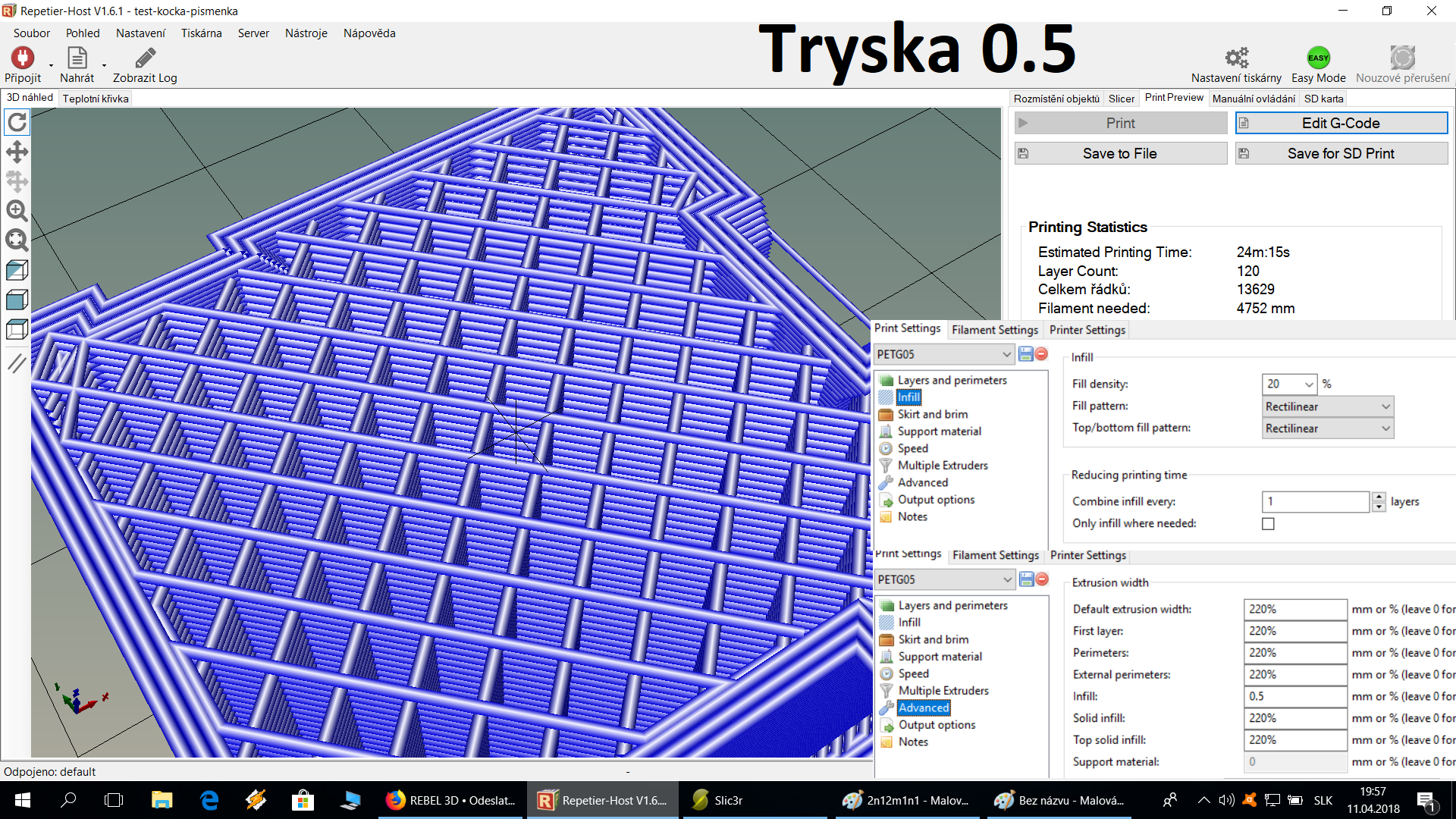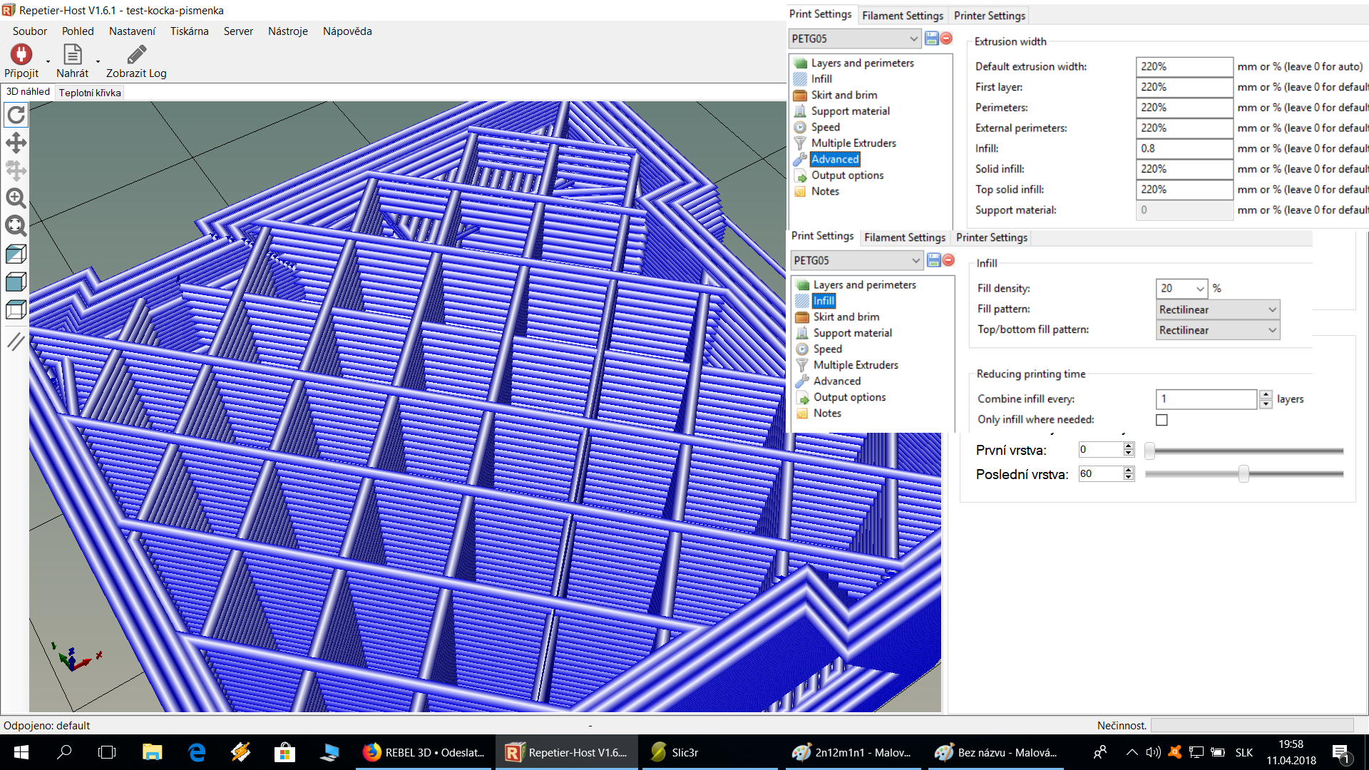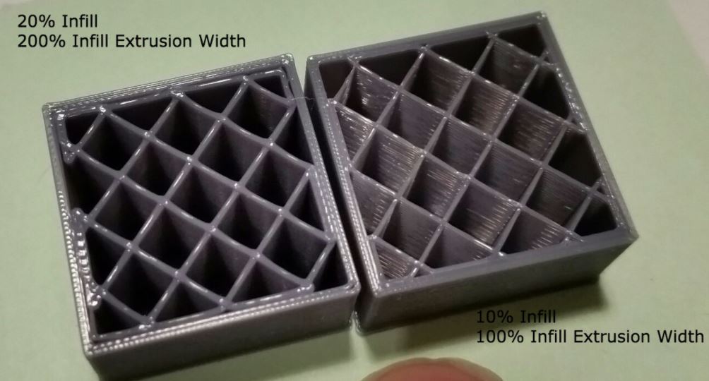 Nedalo mi to a tak som vytlačil nejake pokusy a naozaj, množstvo vytlačeneho infilu zavisi od tej hodnoty v advanced.