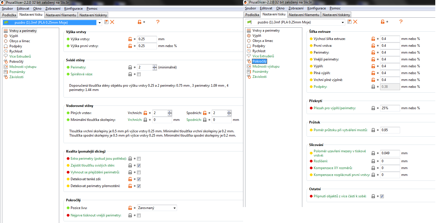 Ved prave som tam mal default hodnoty a bolo to zle akoby preextrudovane a tak som to nastavil vsetko na 0.4 podla Cury. Lebo v prusasliceri nie je moja tlaciaren. Prusaslicer sa mi paci je suprovy a hlavne je tam cestina. Hi