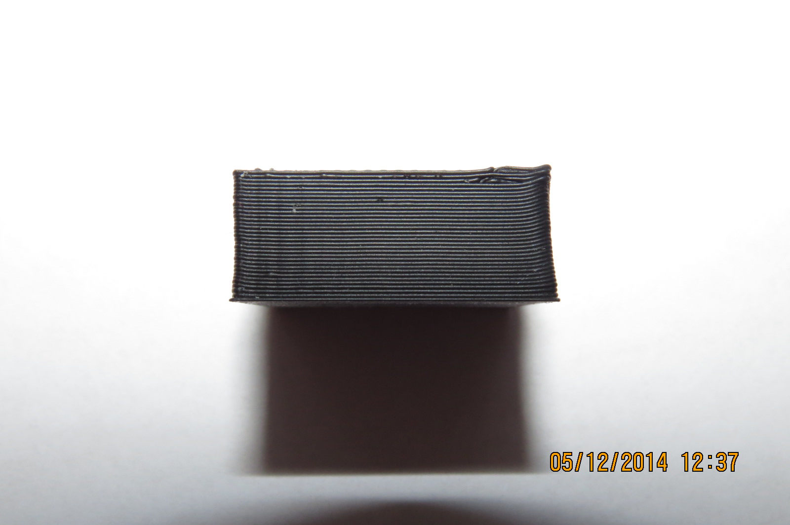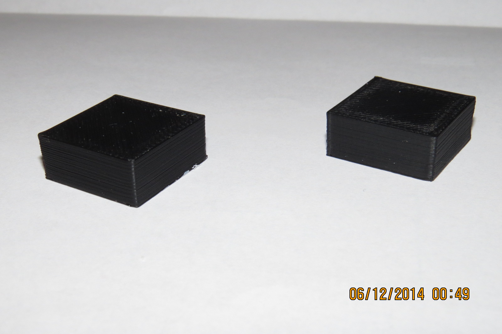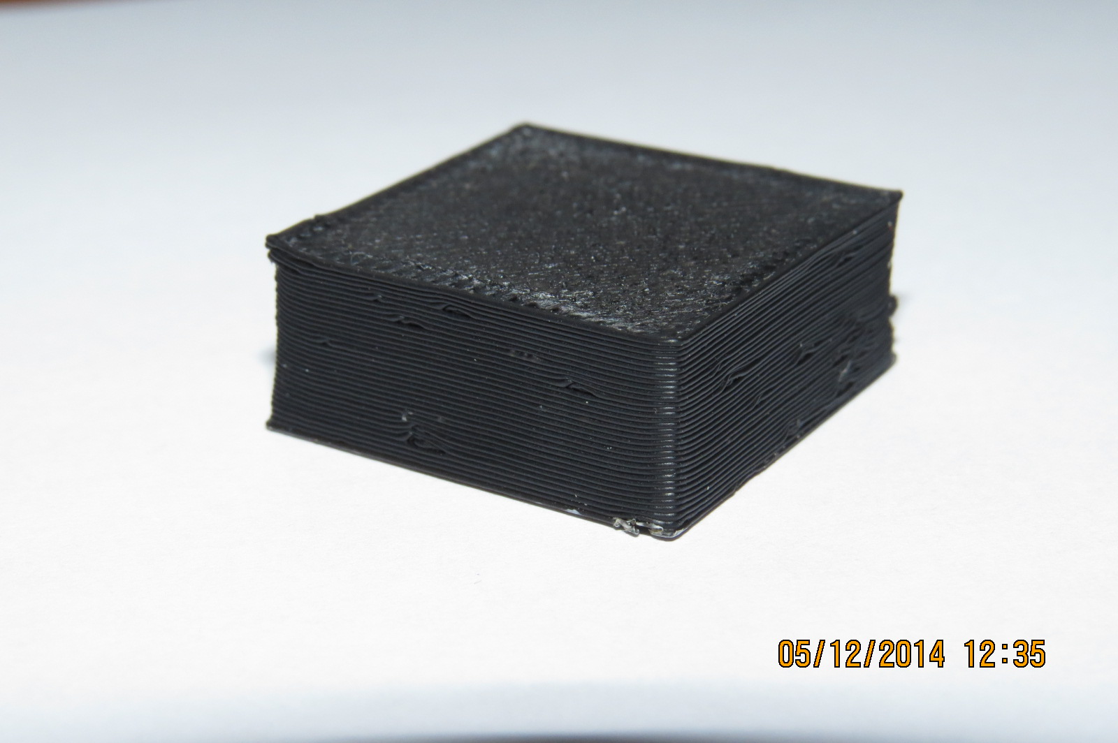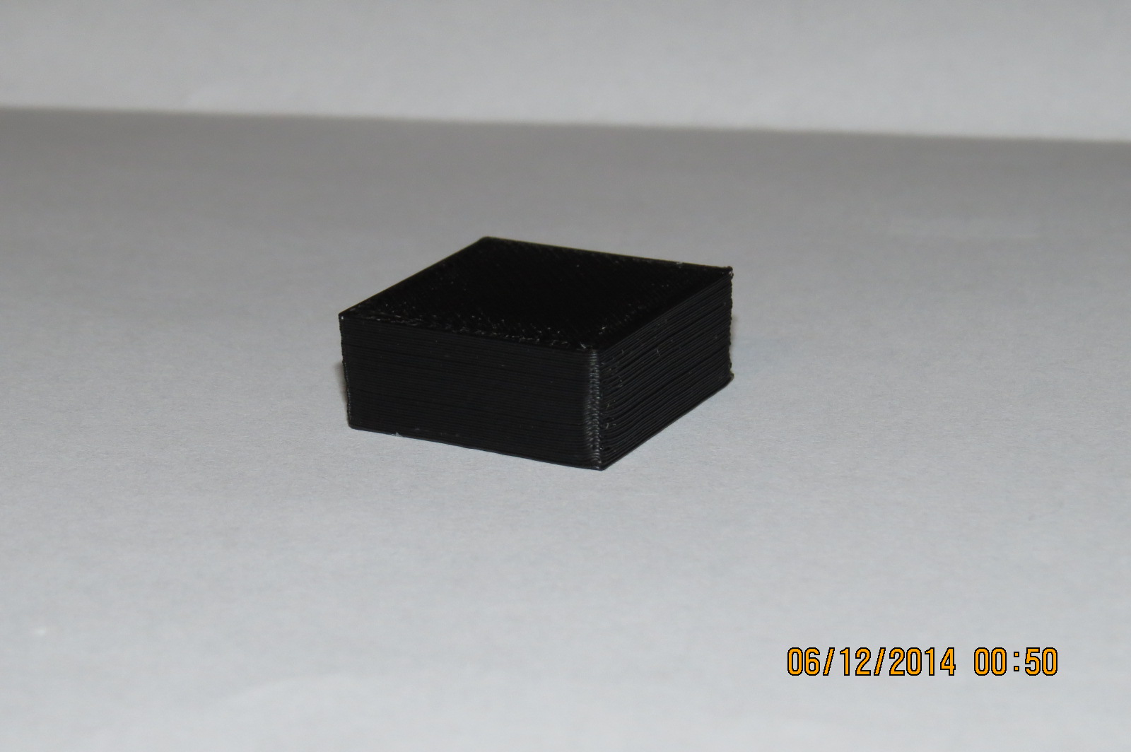 Tak pokus č.2 :) Rozměry, když pominu smrštění, sedí v pohodě. Rozdíl oproti pokusu č.1 je snížení vrstvy na 0,25, tiskl jsem kostky dvě a zarovnal jsem ty začátky vrstev. Teď už se mi to i docela líbí a ta poslední vrstva vypadá taky parádně. Jinak s tím zanášením zubatice mám trošku problémy, že většinou, když měním filament, ji musím pročistit a "vydloubat" z drážek ABS ... Nevím, jestli třeba nemám tu zubatici moc hrubou? Dělal jsem si ji sám na soustruhu myslím závitníkem M6 ...