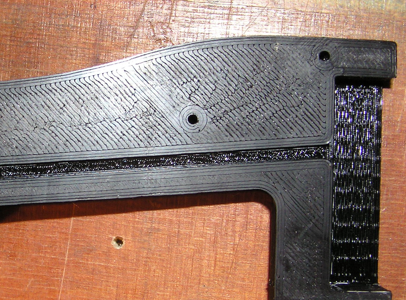Ono to moc poznat nejde... ja bych typoval na moc materialu ale tu vysku vrstvy nevim... Obcas si nastavuji nizsi vysku prvni vrstvy abych mnel objekt po sundani krasne hladky a aby nebylo videt jak se vedle sebe vrstvy lepi... U tebe je na cernem objektu videt jak se vedle sebe lepi vrstvy (ty střeva :) )
