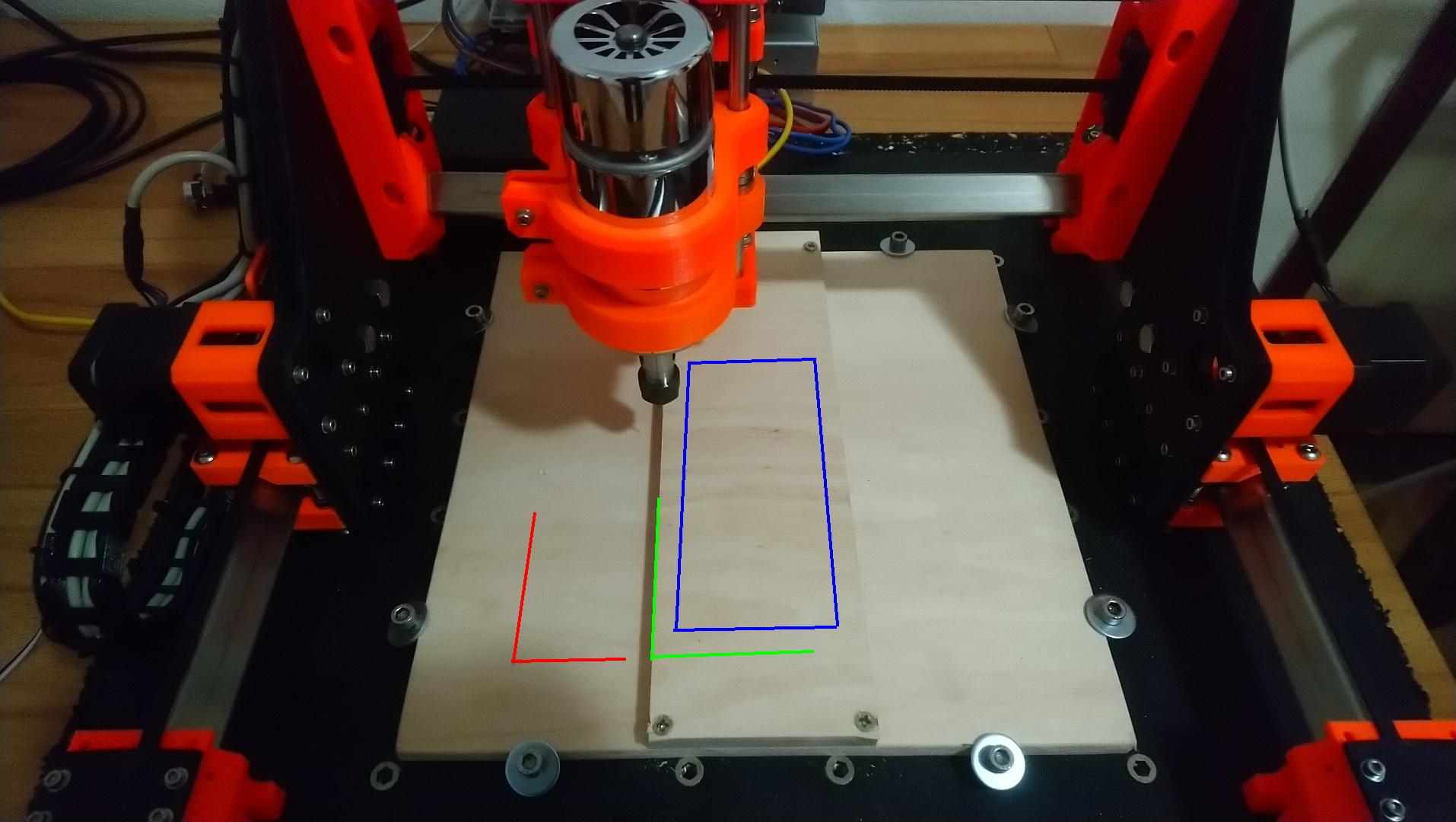 Červeně je 0 stroje. Chci si nstavit zelené souřadnice jako počátek (G92 X0 Y0), v modré oblasti udělat autolevel a vůči zelenému počatku začít řezat. Nastavení výšky Z mi funguje pomocí G38.2. Nicméně Marlin nespustí bez předchozího homu autolevel (G29). Ví někdo jak toto omezení obejít?