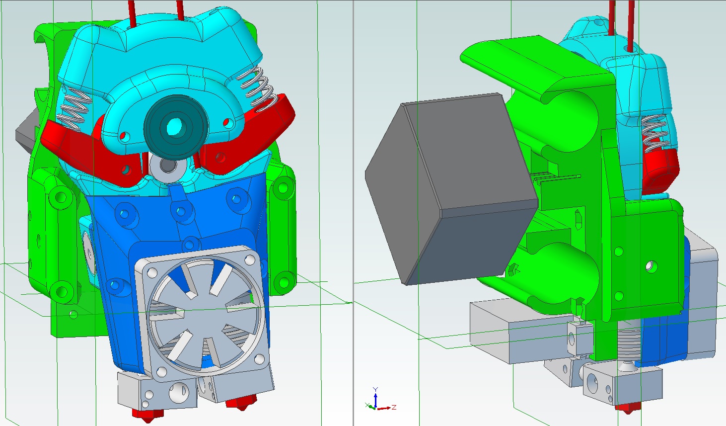 Další moje zkušenost, která by ti mohla pomoct, je nezapomenout na to, že k hotendům vedou nějaké dráty :D . Je důležité si hodně dobře promyslet tvar a kam se chytí ucpávka hotendů, aby nebránila drátům v pohybu při překlápění hotendů. Já jsem kvůli tomu několikrát předělával své modely :).