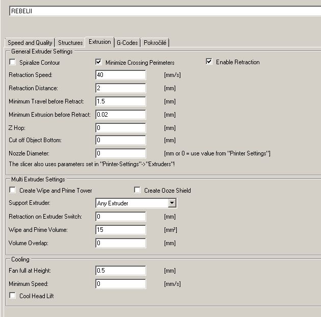 Netuším proč, ale vytvořil jsem si nastavení pro Rebel II, přidal jsem si materiál PLA s 210/80 °C, ale když vygeneruju G-kód mám tam teploty 210 a 80, což mi není jasné, jinak celý tisk probíhá celkem v klidu ale na konci se mi v kodu zvedne osa Z o asi 5mm(pokud jsem to dobře odvodil) s F9000 a vydá to děsný zvuk, patrně motory nestíhají ...