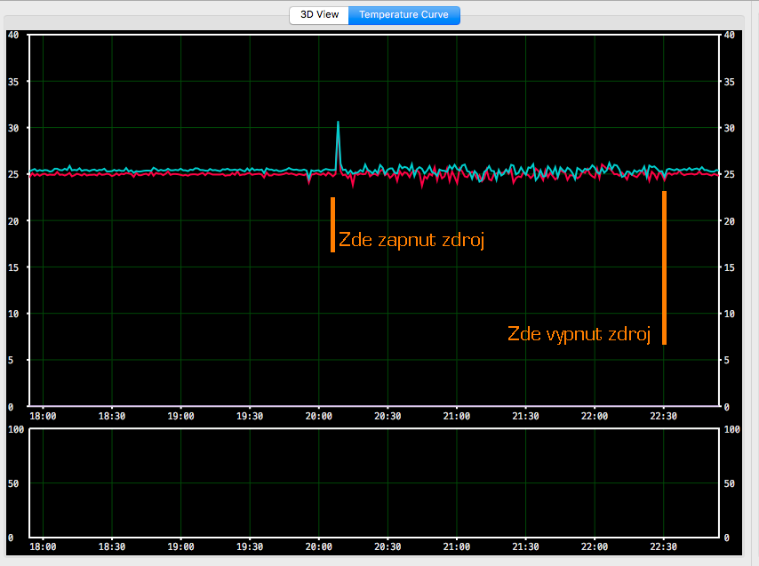 Výměnu zdrojů jsem dělal proto, abych viděl, jak stabilní mají výstup, což se projevuje na měření teploty, která je samozřejmě konstantní za studena. Tiskl jsem kostku při oscilující teplotě 49-50°C. Perioda trvala cca 20 sekund, a bylo patrné vlnkovatění v ose Z. Poté to samé bez vytápění HB, a vlnky zmizely. S vyhlazením (částečným) napětí z regulátoru jsem po PID kalibraci HB tiskl již bez problému. Na tento problém jsem narazil již před rokem, kdy jsem použil PID hodnoty z 20x20 cm na 30x20 cm HB, a vlnkovalo to stejně. Trvalo mi dva dny, než jsem přišel na to, co bylo špatně. Prostě věřte nevěřte, je to tak.