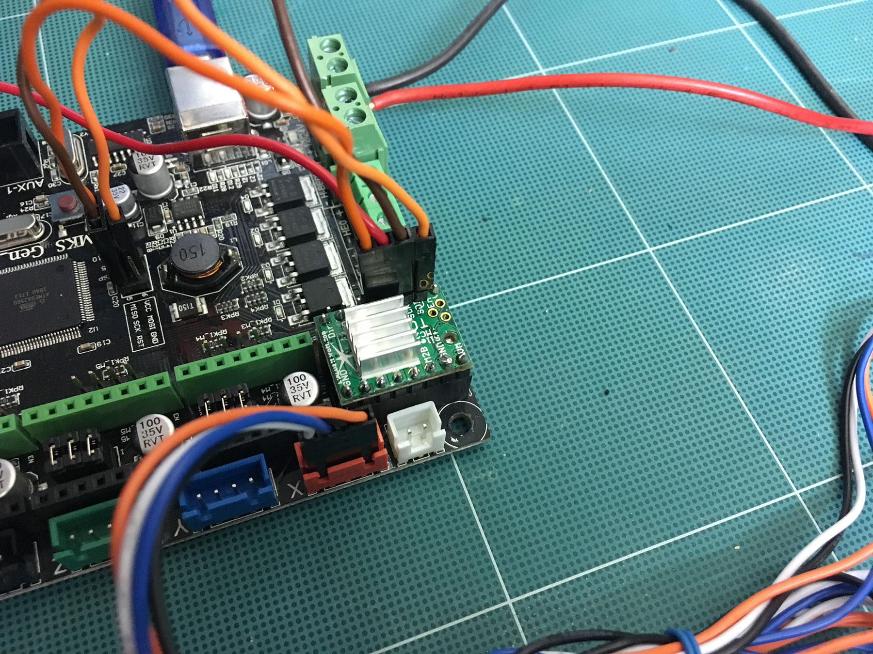 Tak zapojeno a tiskne, hluk na pozadí je druhá tiskárna s 8825 a rezonující ventilátory (starší), už mám připravené Noctua. Více údajů napíšu později, ještě jsem ve fázi nastavování. Nicméně nad 115 mm/s je stealthchop nepoužitelný. Jinak to tiskne suprově potichu a přesně.