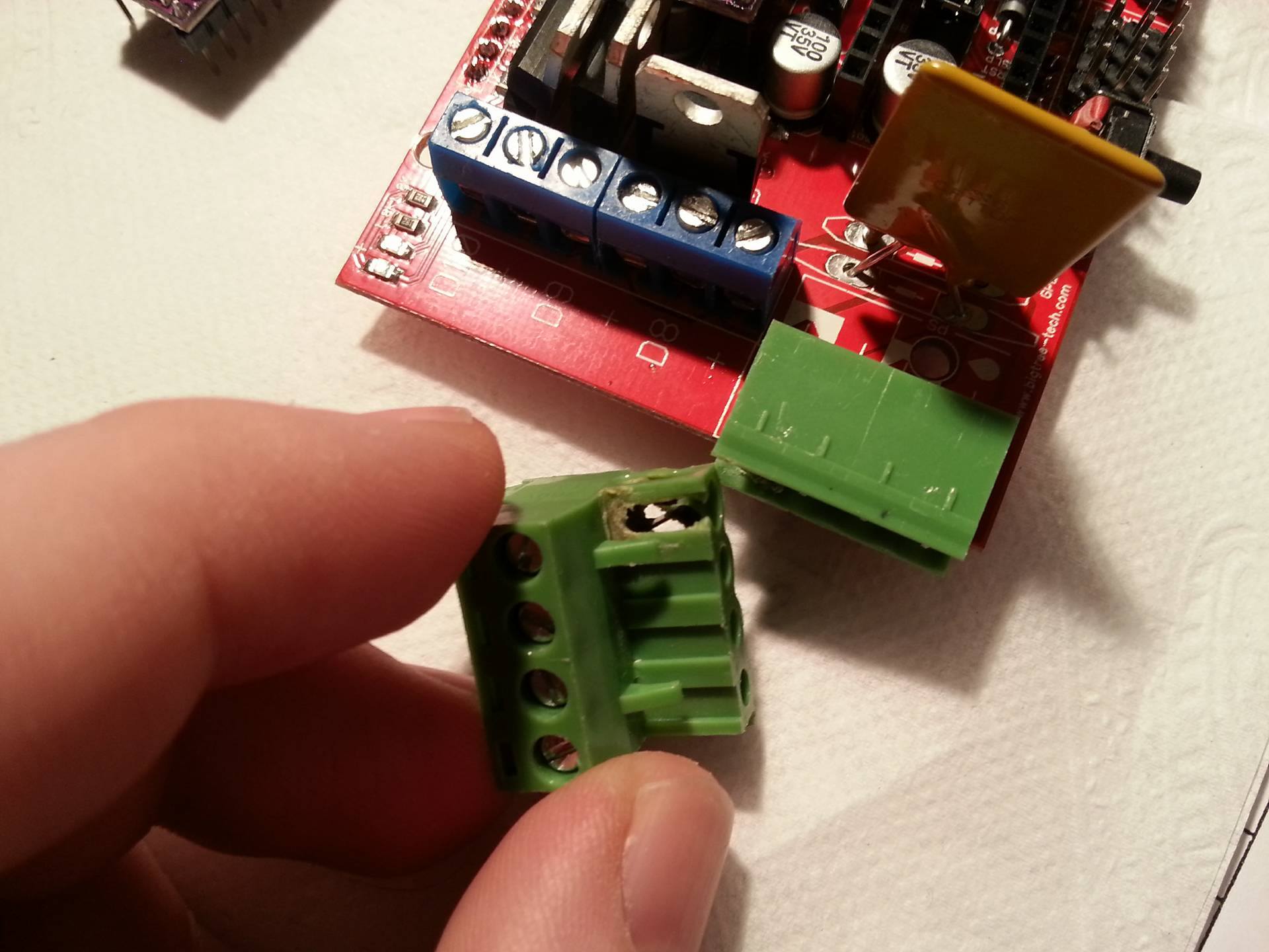 Tak pokracuju v kalibraci a najednou vidim kour, tak sem se lekl, vyrval tiskarnu ze zasuvky a sel hledat, co se zkurvilo tentokrat. Prechodak v konetktoru na privodu 10A... viz priloha.