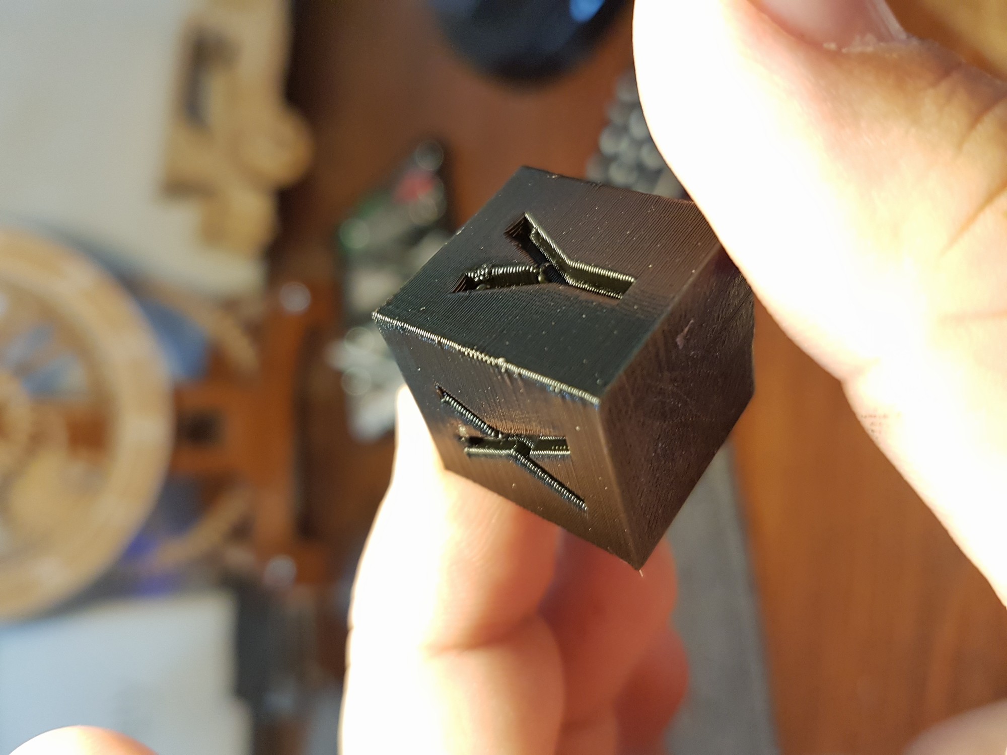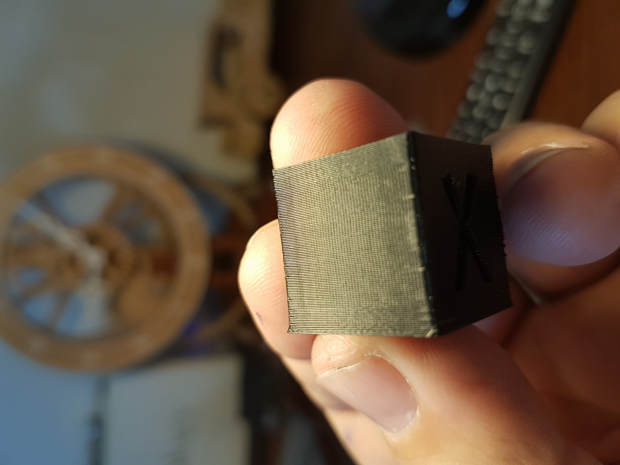 Před výměnou jsem nebyl schopen odstranit kulaté rohy, blbnul jsem s jerkem, akcelerací, ale nikdy jsem nedosáhl takovéhoto výsledku. Na fotkách je první zkušební tisk, je to z PLA ale měl jsem to moc ohřátý nahrubo seřízené kroky na extruderu.