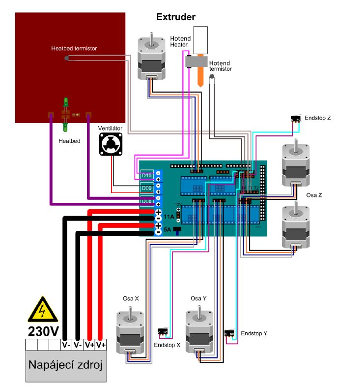 POZOR - spojené dráty dobře zaizolovat, nejlépe smršťovací bužírkou. Na spoji bude během tisku něco mezi napájecím napětím a zemí, a jestli se to dotkne motoru nebo rámu, něco shoří.