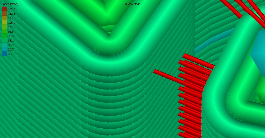 Po přechodu na na full graphics LCD a tisku z SD karty se mi tiskárna začala zadrhávat v místech kde je hodně krátkých přesunů (hlavně v kulatých rozích - viz obrázek). Extruder se na zlomek vteřiny zastavil, protože se nestačili načítat a propočítávat příkazy z SD karty. To způsobilo ošklivý povrch, protože tam během přestávky vytékal plast.