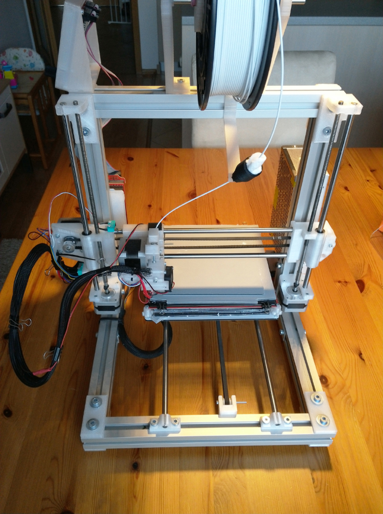 Na tiskárnu jsem přidělal standardní přístrojovou zástrčku se zapínáním a vypínač ke spouštění větráku. Pojezdová osa X je osazena čtyřmi ložisky místo třech. Na tiskárně lze tisknout, ale ještě by si zasloužila lépe zkalibrovat.