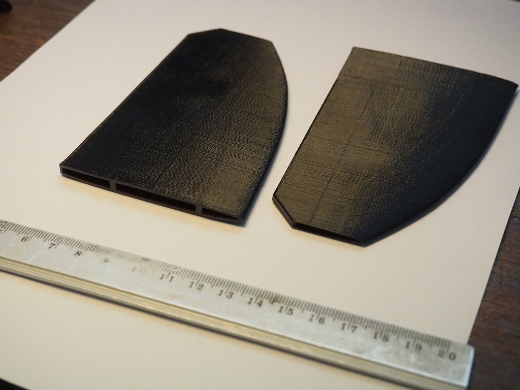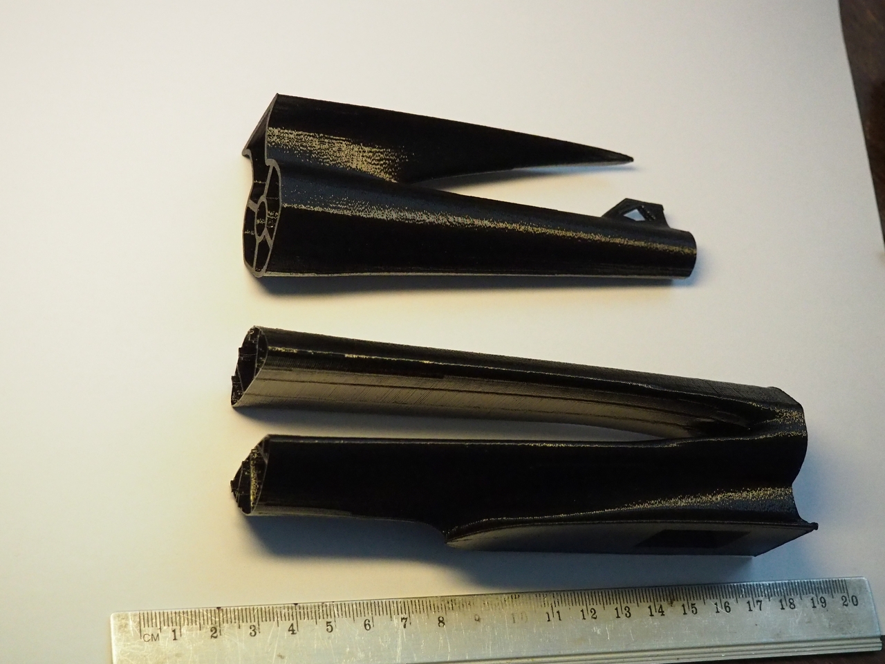 Včera jsem si přivezl vzorek nového ABS a tak bych se rád také podělil o výsledky testů. Zkusil jsem nejdříve něco malého (klasickou žábu) a to prošlo v pohodě a tak posílám fotky z tisků části letadel od 3DLab printu. Na prvním obrázku je část výškovky ke Spitfiru a na druhém část trupu k hotlineru EasyMax. Tloušťka obou výtisků je v hlavní části jeden perimetr bez výplně. Trup má dva perimetry do výšky 26 mm... A to že se to nerozpadlo ani neodlepilo od podložky je výborné.