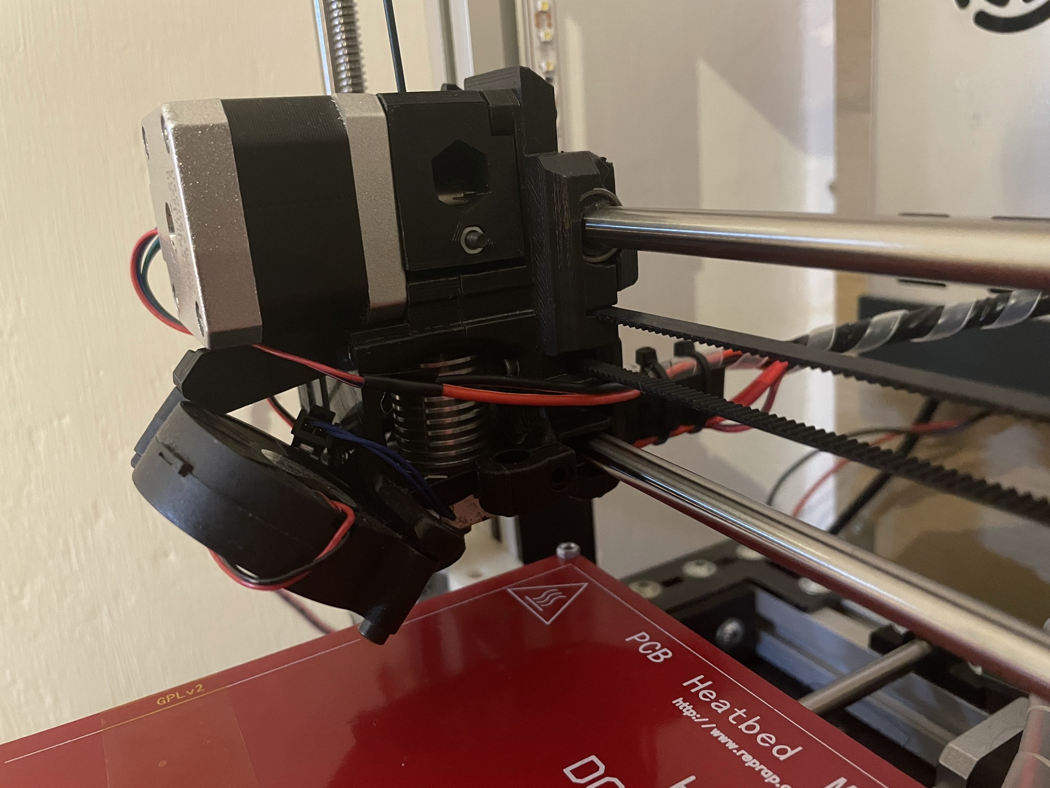 - extruder z Prusa MK3s upravený na rozteč osy x, tištěno PET-G, ABS hotend E3d a rebelMod