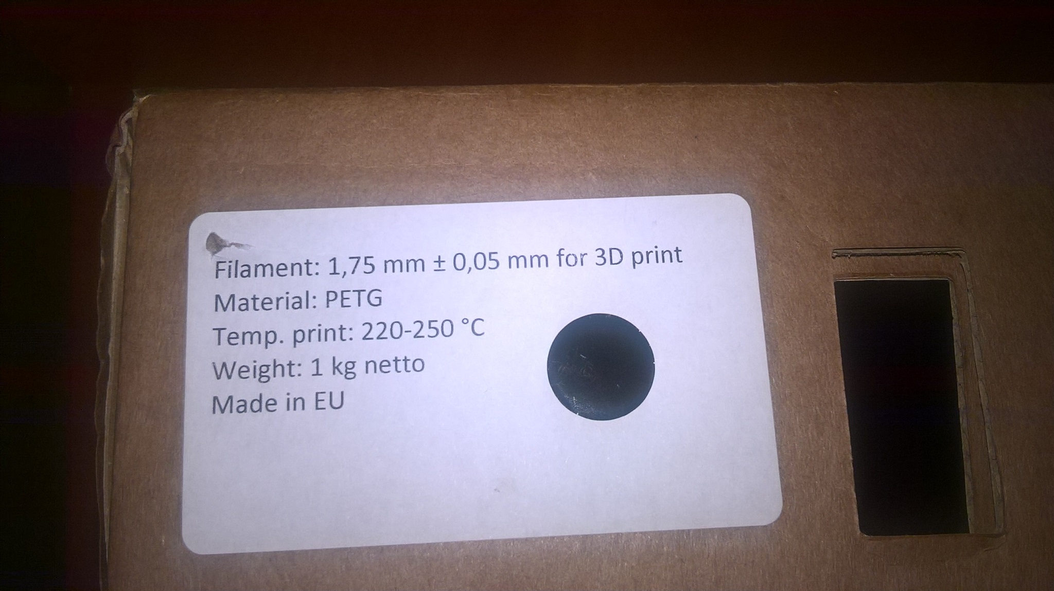 A poslední je černý PETG již použit, struna má ještě 750g a je převinuta na jinou špulku, popis a barva opět v obrázku níže.