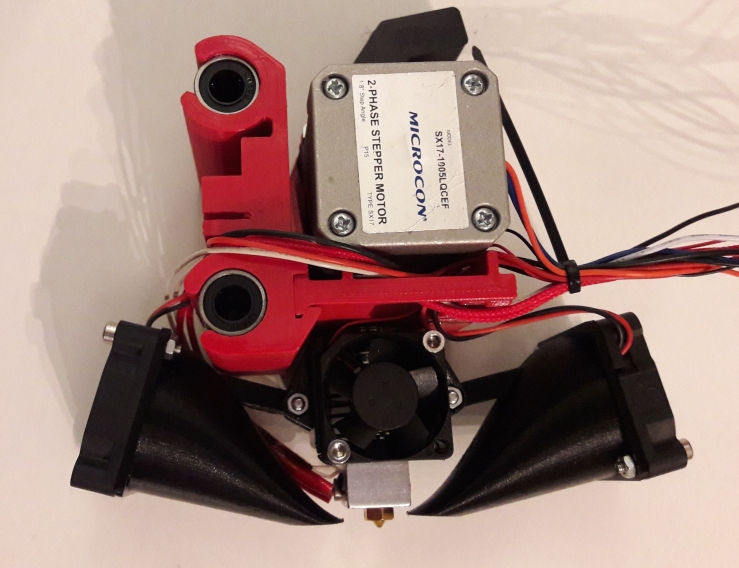 Nabízím kompletně osazené, odladěné a sestavené single extrudery v poslední verzi, včetně hot endu, kvalitních kovových ložisek nebo kluzných Igusů, zubatice, termistoru, kabeláže, motoru Microcon SX17-1005, 1x 30mm větráku chladiče hot-endu a ofuků výtisku s 2x 40mm větráky.