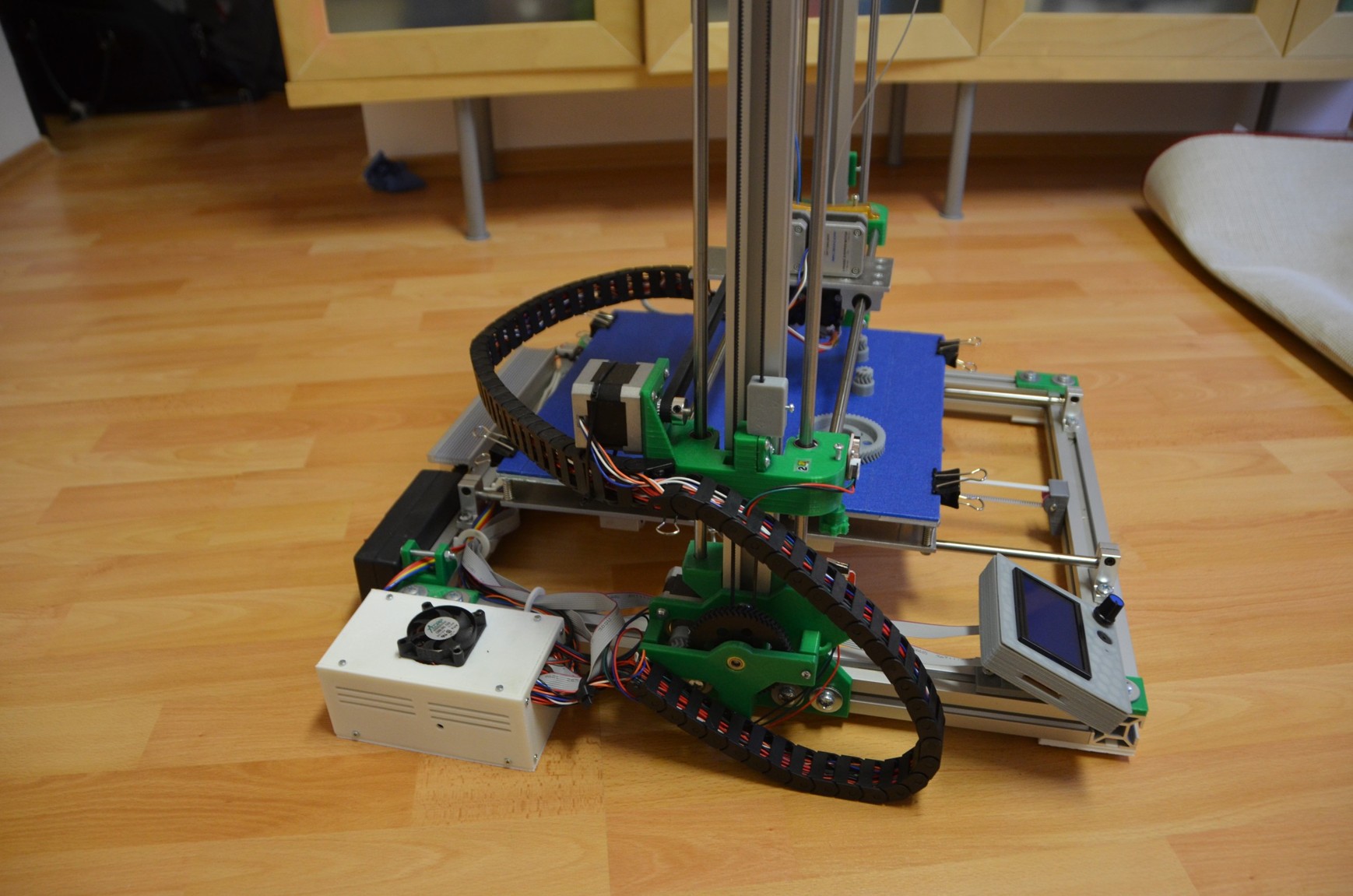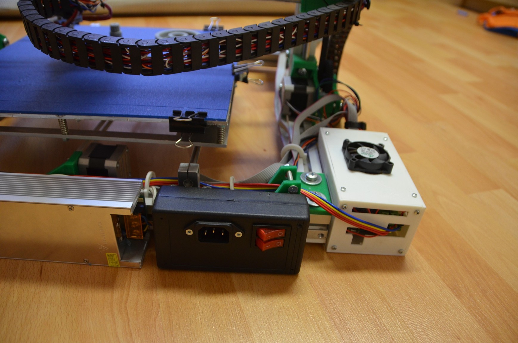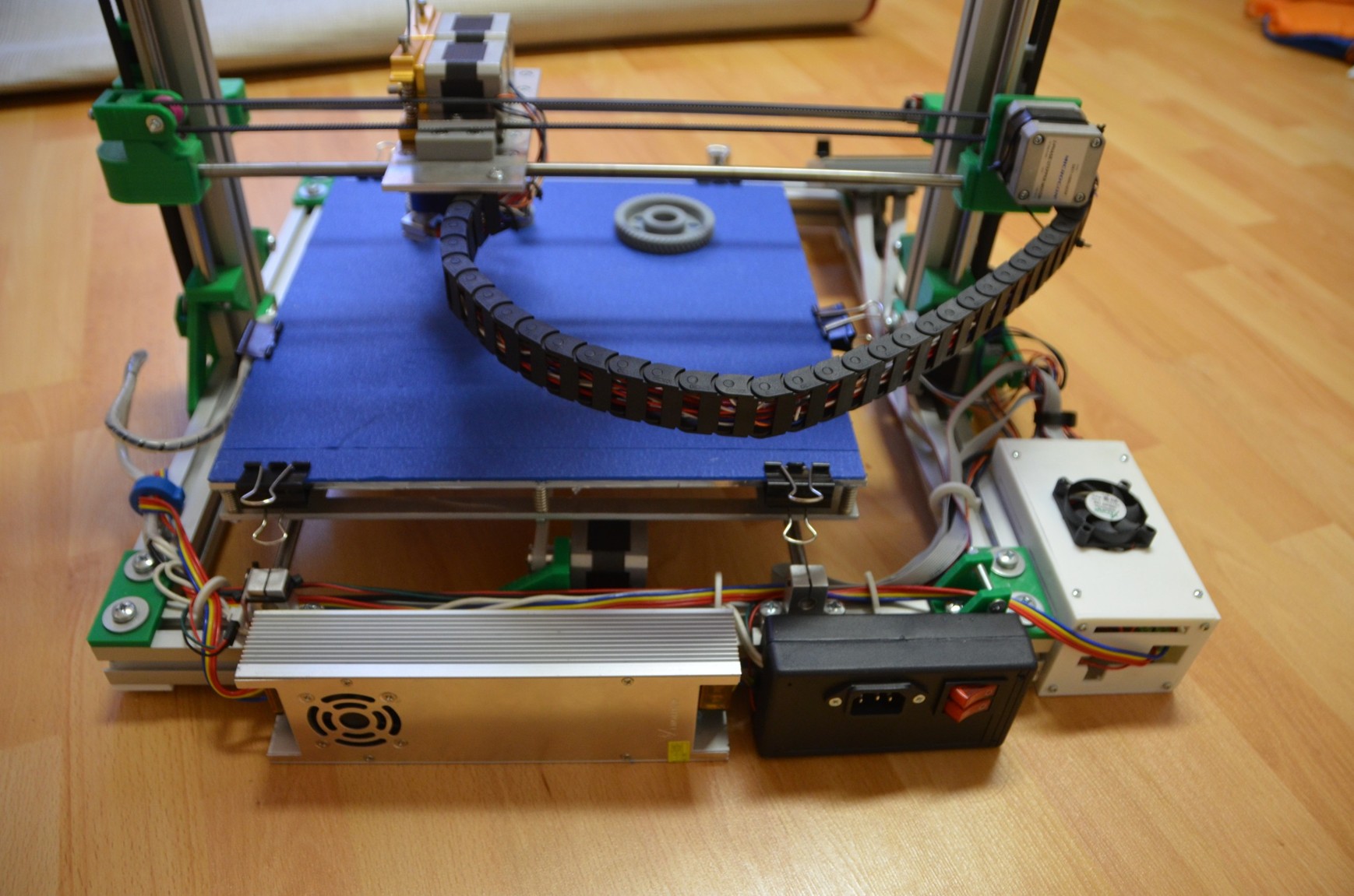 Bed zateplený a vyhřívaný podložkou 240V 750W řízené přes relé z RAMPS 1.4 Tiskárna má ložiska v hliníkových domečcích. Napájení zdroj 12V 450W v hliníku. Kabeláž strukturovaná do robotických pásů.