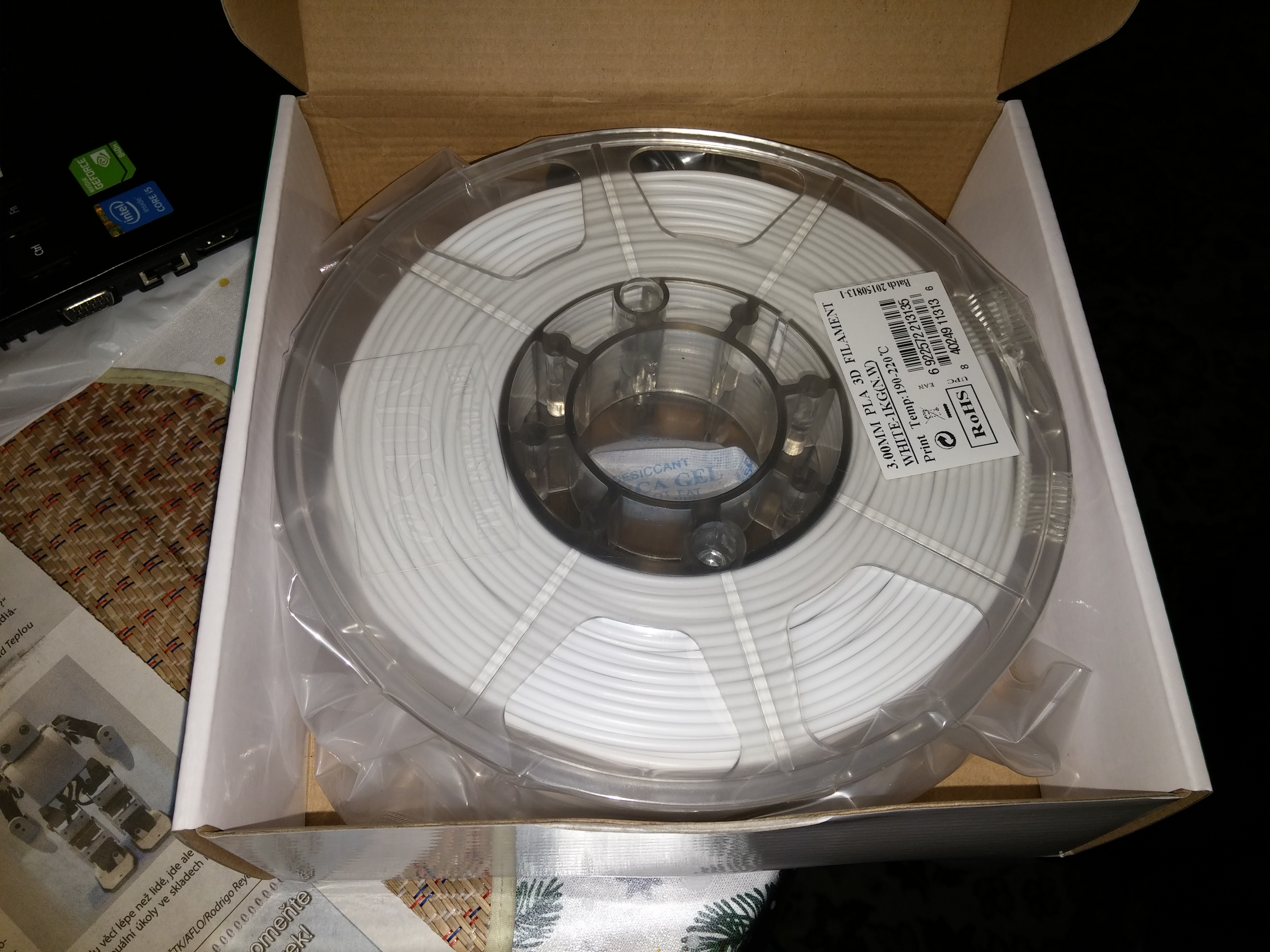 Prodám filament 1x PLA průměr 3.00mm White 1Kg. Filament nový, nerozbalený. Špatně jsem objednal velikost strunyI