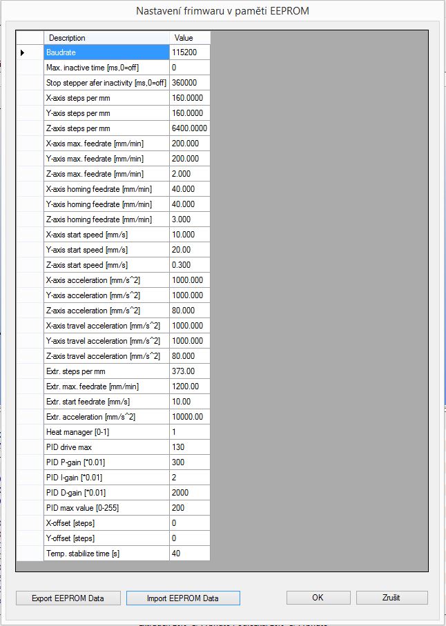 no, naimportoval jsem tu eeprom do virtualni tiskarny v repetieru a ty popisy jsou trochu jine, nez jso uve FW. hlavne co se tyce jednotek. u tech feedrate jsou ve FW mm/s a ne mm/min.