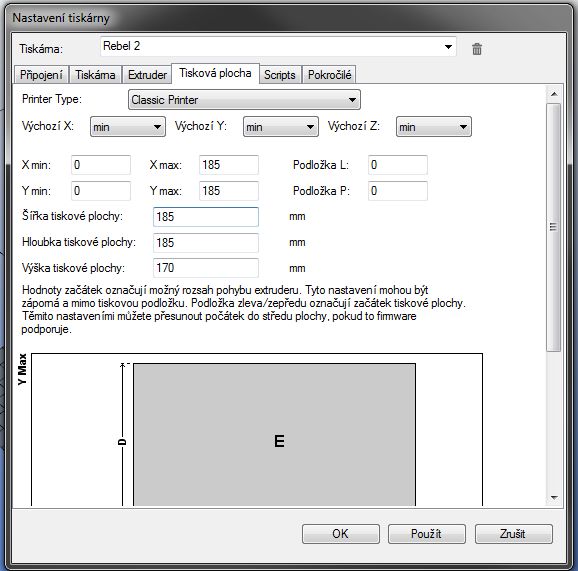 Zkoušel jsem to nastavit pomocí MIN MAX X/Y, ale to nefunguje jak má. Chci využít co možno nejvíc prostoru pro tisk, ale teď když dám tisk doprostřed, tak se to tiskne je pár centimetrů od krajů. :-/