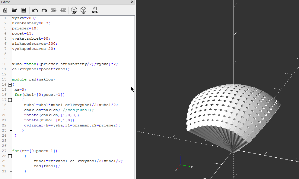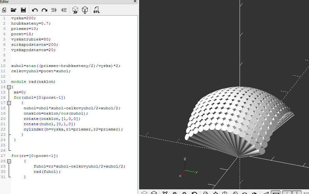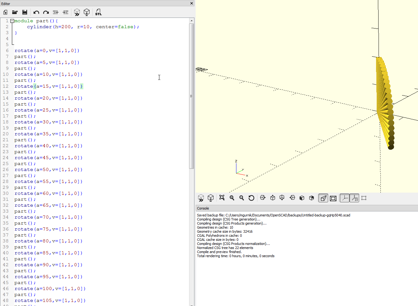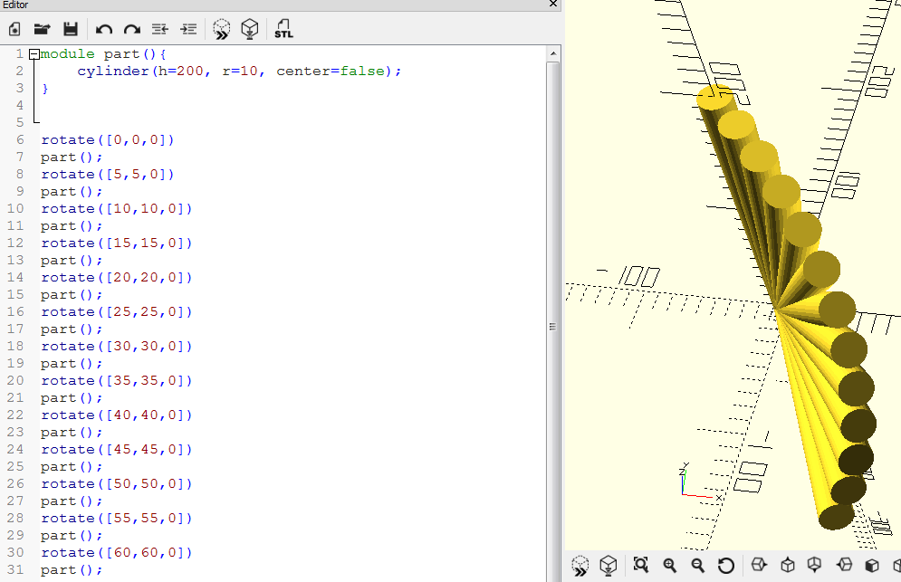 asi mam nedostatok vedomosti o geometrii. ucim sa robit s OpenSCADom a potrebujem otocit objekt vo dvoch osiach v rovnakom uhle. Ocakaval som, ze budu usporiadane v priamke, ale idu do spiraly.