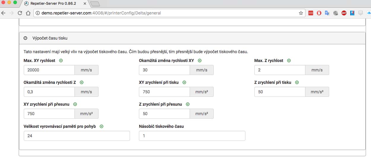 jelikož pracuji a běžně nemám tiskárnu sebou, tak jsem ti odstřelil obrazovku demo verze repetierserveru. Jinak ten mi počítá hodně přesně, umí si stáhonou data z nastavení tiskárny a pak pri importu gcodu s tim pracuje.