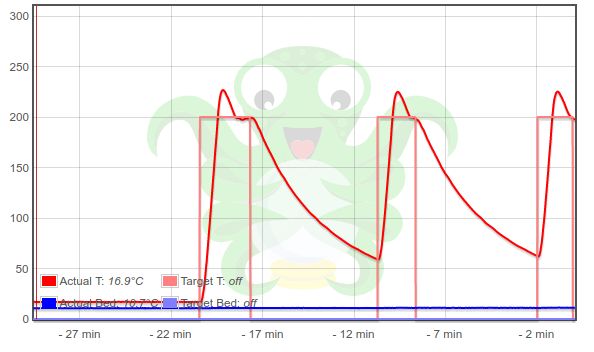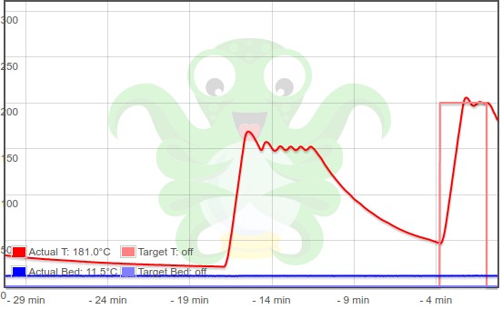 (resim to proto, ze pri nahrivani na nylon 280C mi to preleze maxtemp - mam nastaven na 305C. Pred tiskem musim rucne nahrat nejdriv na 250, ono to dost presvihne a pak pomalu zvysovat na 280.)