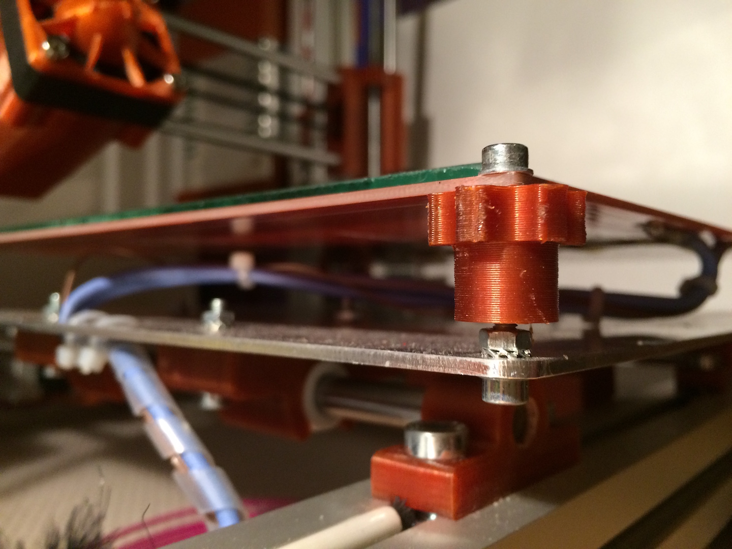 No a pak se plastový díl našroubuje na pevný šroub v podložce - tím se seřizuje hotbed v každém rohu.