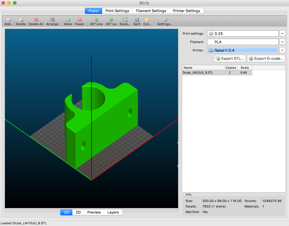 Tak jsem to vyzkoušel taky, na Windows, Repetier host 1.6.0, slicer 1.2.9. Už model vypadá divně, při pokusu o slicování vyskočí hláška "Alespoň jeden objekt je mimo tisknutelnou plochu. Zrušit slicování?" Když to přesto chci vyslicovat, tak to dopadne viz obrázek.