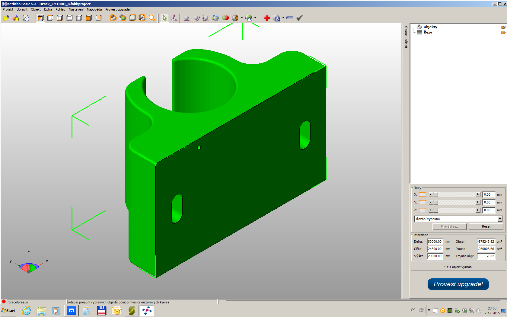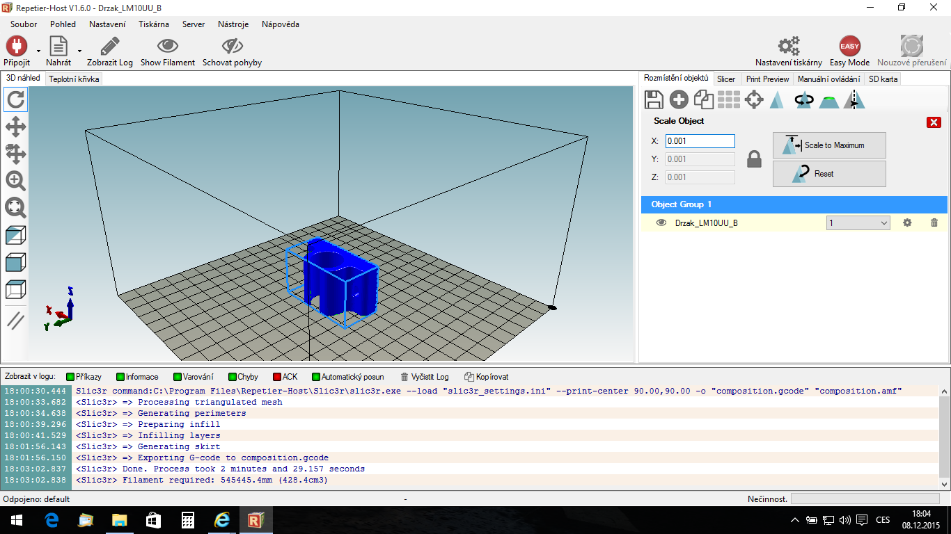 Ahoj, asi jsem vyřešil problém držáku a sli3eru. V rozmístění objektů jsem klikl na Scale Object a jako velikost x jsem zadal 0,001. Teď to snad vypadá tak jak by mělo, i sli3er vygeneroval g-kod bez chyb