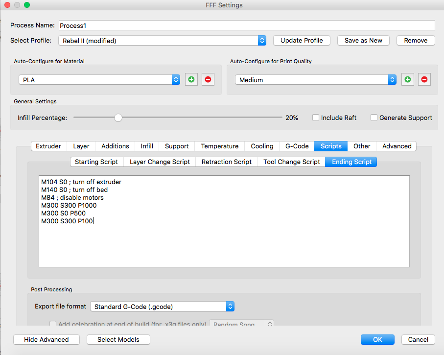 asi to uz poznate, ale na fore som to nenasiel. Chcel som, aby mi Rebel zapipal svojim nadhernym hlasitym pipakom po ukonceni tlace a v GCODE wiki som nasiel prikaz M300