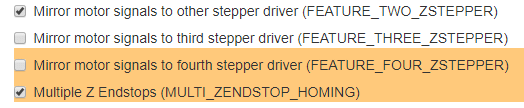 Treba nastavit na karte "Mechanics" pre Z motor "Mirror motor signals to other stepper driver (FEATURE_TWO_ZSTEPPER)" a az potom je mozne aktivovat "Multiple Z Endstops (MULTI_ZENDSTOP_HOMING)".